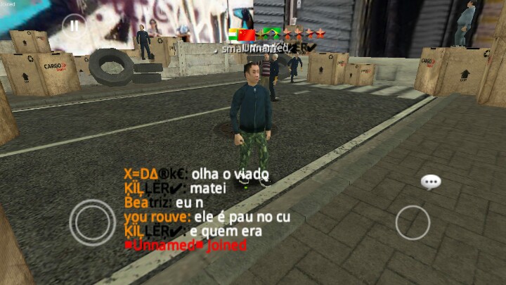 看这个黄色的星星就知道我牛b,左边那个是走路,右边那个按键是攻击,之后见到很多外国人,但有时候没有这么多,打人赚分数,顺便赚杀敌数,就是图二的那个 kill:XXX ,人家打你的话,会死亡,就是图2旁边那个红色的东西,就是死亡的次数,出生点大奇迹,玩法太......