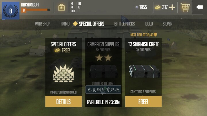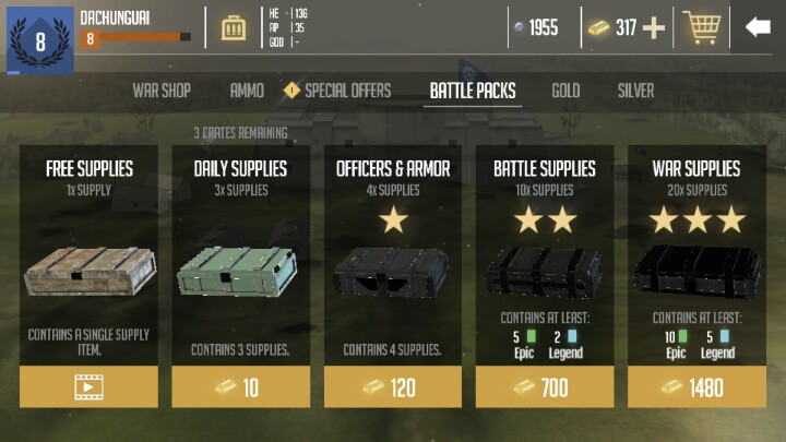接下来就是大家喜闻乐见的,区分非欧人种的神秘之地,开箱子!这里洒满了无数非洲酋长的血与泪,这里是黑人的屠宰场,不知多少妄图偷渡欧洲的非洲人亡魂在这里游荡…… 咳咳…好了,回归正题。开箱子一共两个页面,一个是特殊的,就是不需要金条,靠达成某些目标就可以开箱子的地方。第二个就是必须正常的用金条开箱子。 特殊箱子一共两个,第一个每日一次,需要在时间冷却后打一次战役,才可以领,奖励很丰厚,相当于一次120箱子。但出的东西范围和10金条箱子一样,什么都可能开出来。
