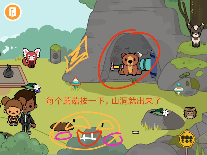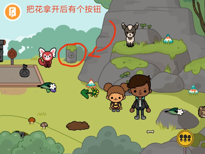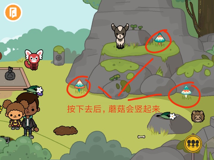3.公园最边边山旁边有几个东西,覆盖住的有一个开关,可以使山上那些小蘑菇动起来。