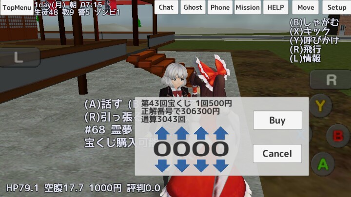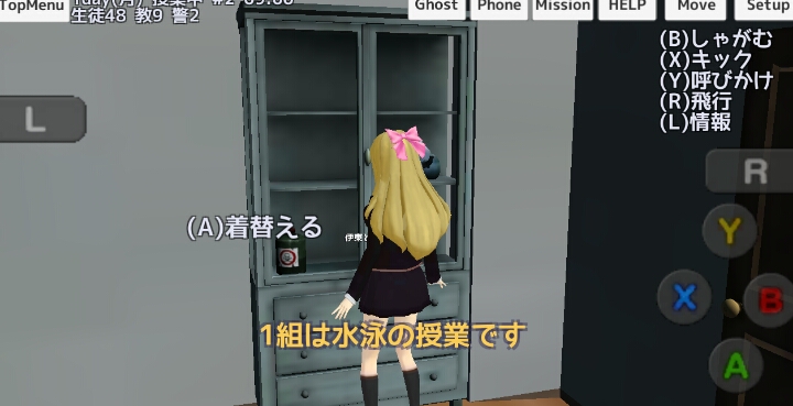 然后看第二张图,一进游戏我们就会在自己的房间里,左上角显示了日期时间以及人物数量。一共有48个学生,每个人都有自己的编号,女主是3号,在一班。这个女主身上也有写的啦。左下角显示了血量,饥饿度,先有资金和评价。饿了记得吃饭,学校门口有两家买东西吃的店,一个比较大的有两个女仆,基本咱们学校的人都来这吃,还有一家小黑店,买到的东西是随机的,有一会我买到了一个僵尸头没仔细看就吃了结果变成了僵尸QAQ学校里教学楼左边也有一个餐厅,有一个老师负责卖东西,老师不在是买不了的。