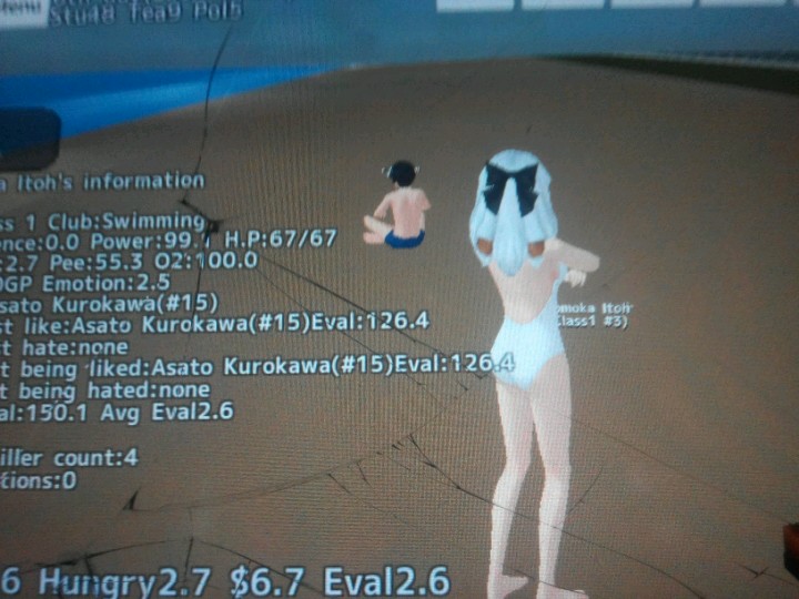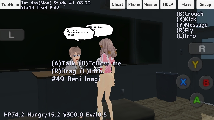 然后看第二张图,一进游戏我们就会在自己的房间里,左上角显示了日期时间以及人物数量。一共有48个学生,每个人都有自己的编号,女主是3号,在一班。这个女主身上也有写的啦。左下角显示了血量,饥饿度,先有资金和评价。饿了记得吃饭,学校门口有两家买东西吃的店,一个比较大的有两个女仆,基本咱们学校的人都来这吃,还有一家小黑店,买到的东西是随机的,有一会我买到了一个僵尸头没仔细看就吃了结果变成了僵尸QAQ学校里教学楼左边也有一个餐厅,有一个老师负责卖东西,老师不在是买不了的。