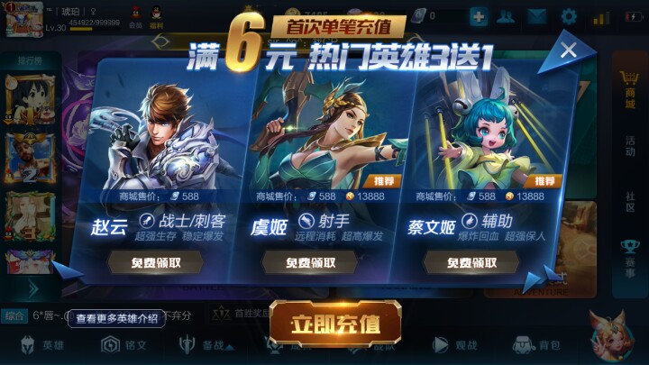 而赵云只能在首充6元时获得!或者花58.8元来购买!如果你首充六6元时不选择赵云的话那么你再想要这个英雄就必须要花58.8元来购买了!其余两个英雄都是可以使用金币购买的金币可以慢慢存!新手存金币很快的!所以没有获得另外两个英雄的各位也不要灰心丧气!那么你是愿意花6元来买58.8元才能获得的英雄呢?还是愿意花58.8元来买6元就可以获得的英雄呢?
