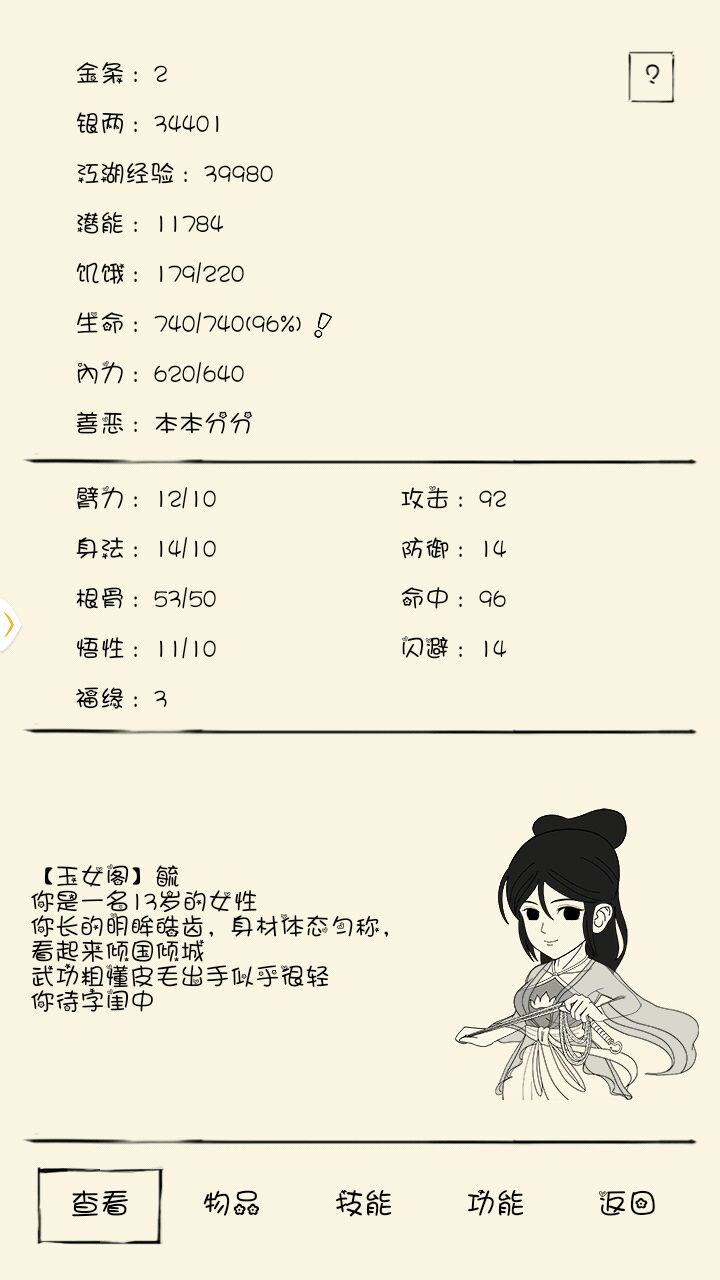首先说一下这个游戏的玩法,这个游戏主要靠打桩发育,打桩可以获得潜能,江湖经验等潜能可以用来升级技能江湖经验决定了你的命中,闪避,输出等等这两个东西极其重要所以,你要不停打桩,打桩一次4个小时,月卡另算。打桩结束接着来就好了。接着说游戏其实的出生加点前面是一大群人说的什么烂加点都是些什么首先这个游戏你不管玩什么门派都可以的加点40臂力 30身法 0根骨 0悟性输出极高的加点60臂力 0身法 0根骨 0悟性闪避极高的加点20臂力 50身法 0根骨 0悟性前期发育极快的加点0臂力 0身法 0根骨 60悟性这些就是出生时的加点我看很多人都喜欢加一堆根骨,实话说,根骨没啥太大的作用,主要就是加血量,内力,修炼速度,然而这些东西完全可以靠臂力来弥补,因为臂力也可以增加血量。所以,加点时不要加根骨,很多人都在意角色的长相,根骨确实可以增加长相,然而你长得好看能当饭吃?这个游戏容貌再高也没什么用,还是武功高才实在,而且,按照我上面那几个加点方法来,你也不会丑到哪里去。还有就是npc这个游戏npc极强,你要对症下药,找自己打得过的人,打npc是可以掉装备的,装备主要就是来自npc。如何来查看npc的武功我们以游戏最强npc神秘人为例子第二排的武功是一个人的等级前期武功分别是不堪一击,初学乍练,略知一二,粗懂皮毛,初出茅庐,初窥门径略有小成,略有大成,出类拔萃,登堂入室,青出于蓝。一个武功等级为10级。99级及以后每升10级都需闭关突破,这个游戏还能双休。。。江湖经验没有具体的划分,还是以神秘人为例如果你与他的江湖经验差距过大,就会显示为深不可测,差距略小则会显示为旗鼓相当,略逊一筹,略胜一筹等,所以江湖经验如果差距过大的话,不要去作死挑战。再说升级武功,这个游戏有很多门派,随便找个喜欢的加入就好,还有逍遥散人也是如果门派主学拳法或剑法,你就要升级基本X法(X包括基本剑法拳法刀法棍法等等),在升级门派相应的武功,基本X法是学习相应门派武功的基础,一切门派武功不会高于基本X法。例如,如果我加入了太极门 太极门主剑法,我们就要升级基本剑法,基本内功,基本轻功,我们学什么就升级什么,而轻功和内功是必须要升级的。就这么多了。