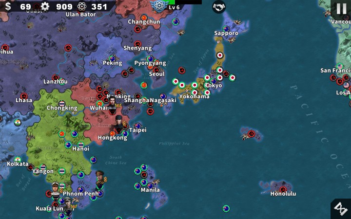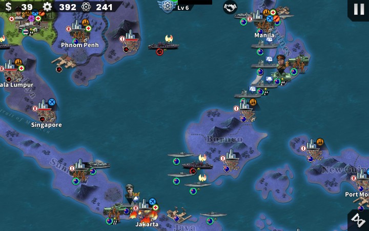 成功出去之后就好打了,潜艇继续占港口,注意别让敌舰靠近我方港口,这东西速度快得惊人。注意别乱花钱造人,钱真的很重要,占领马尼拉之后就可以一路放伞兵占城,队友和敌人激战,到处是空城,只怕钱不够,能占到东京这样的大城市就是捡到钱,队友的城也要占,城就是钱,反正队友不会像欧陆4那样表示愤怒并解除同盟,不用造人守城,出城继续港口,城被夺走还可以抢回来,多付出一次空袭的钱而已,而港口一旦出敌舰就恶心了。