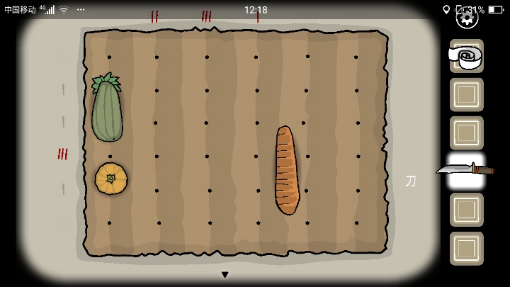 2.用弯刀砍烂地上的水果,找到一只鱼饵虫子。