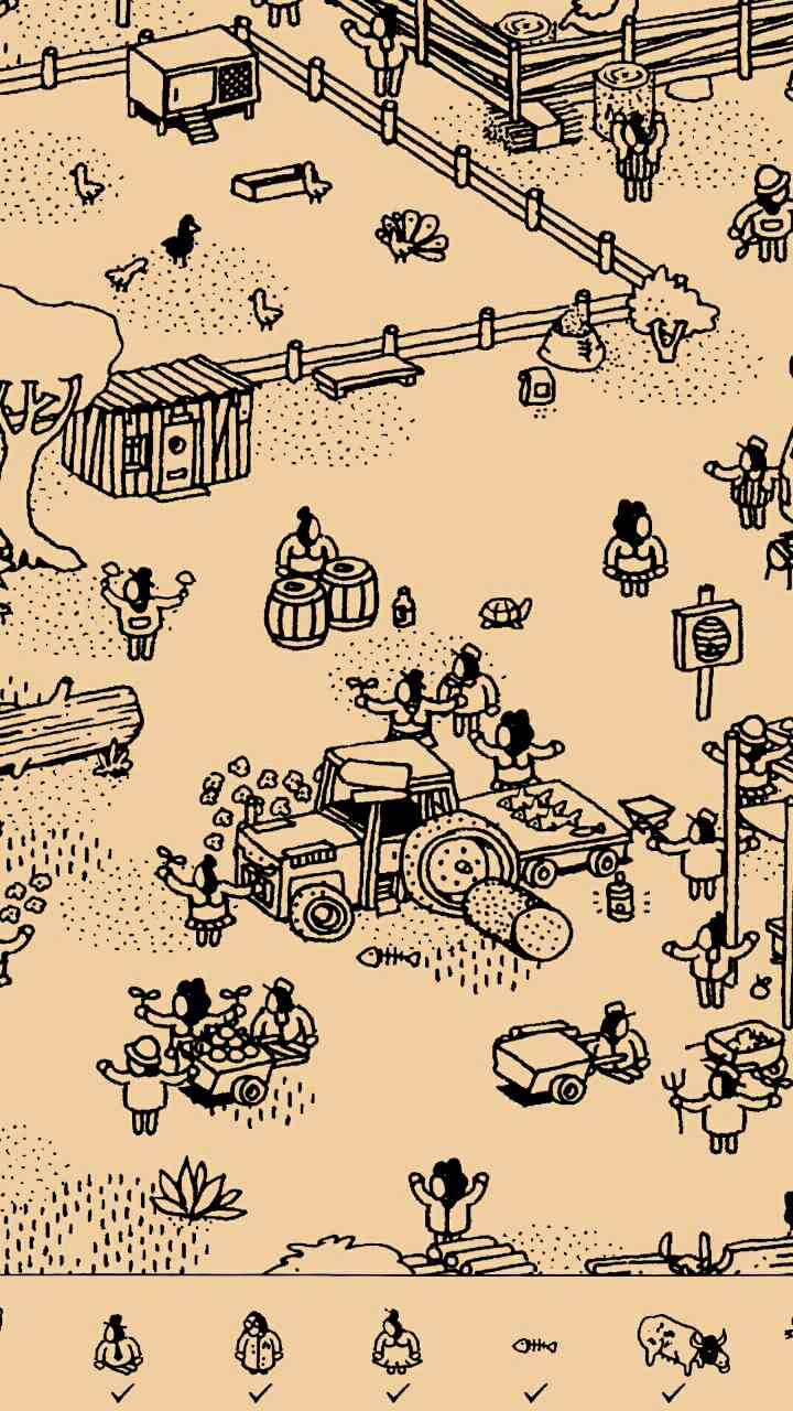 值得一提的是游戏新增了一个章节,五个章节完成过后,有最后一个拼出游戏名字即hidden folks,挺有趣的。完成这个小挑战过后会出来一个大地图,地图上出现的人和事物全部都是之前关卡中找到的,他们组成了一个新的场景,即是一个新的小世界~好有情怀