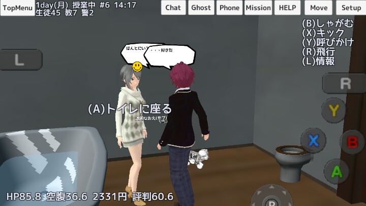 按A跟NPC聊天,Y是夸奖,B是骂Ta(哇当着面骂666),请到一定的程度之后就可以交换电话号码或者表白(*'▽'*)♪,放电话号码之后,手机里就会存入他的电话号码,可以查看时间线和呼叫。选择呼叫如果没有什么事Ta就会跑过来,但是也有几率会说Ta自己很忙。恋爱的话,可以亲亲,一起睡觉,跟谁时候可以一起骑车开游轮,有时这会跑过来对你说“ I love someone”Σ(|||▽||| )记住亲时不能被风纪委员和老师发现,不然会被抓