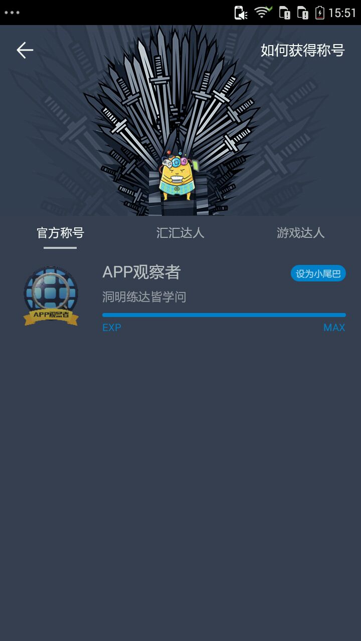 其实汇汇也有很多特殊尾巴的!比如汇汇一万楼……貌似我在汇汇里面就看到两个人拥有过这个称号!我觉得还是这种可以显示主页的特殊称号来的实在!噗╮( ̄▽ ̄)╭说到观察者不能显示到主页,这不正符合观察者的特性吗?(笑哭(ಥ_ಥ))