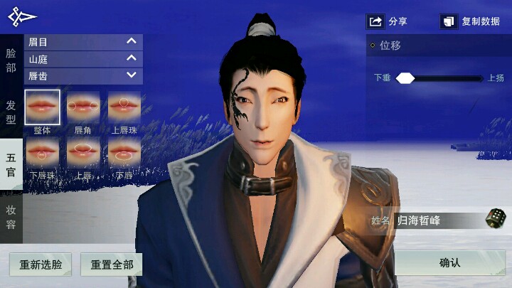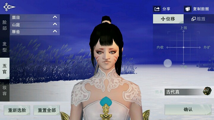 4.最近很多的游戏都可以自己创造一个人脸。在这个游戏里面叫做捏脸。我第一次捏没经验捏出了一个评价清秀的脸(就是我儿子啦)但是,请你仔细看看我儿子的含情!桃花目!是不是一股要断袖的感觉呼之欲来!╮( ̄⊿ ̄)╭我第二次捏了一个小可爱,我就是给你们秀儿子的。