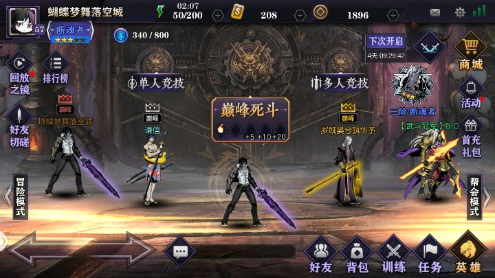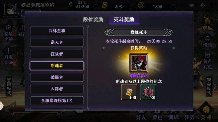 说完了PVE,再说说PVP,对决模式――单人竞技、多人竞技、巅峰死斗,可去隔壁大神参观,我把巅峰死斗段位展示一下