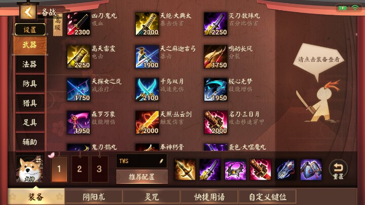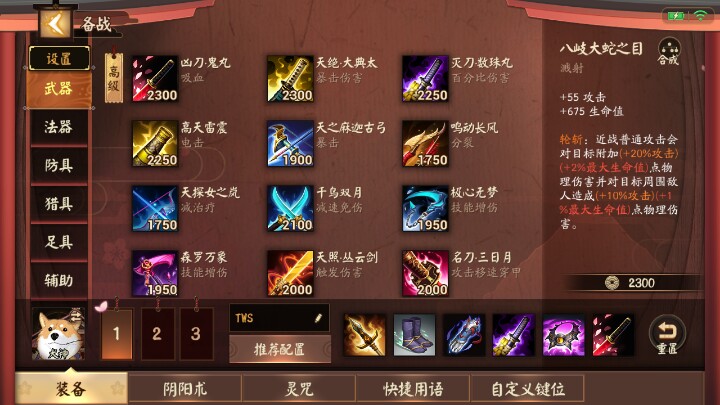 其实啊关于出装这个东西呢每个人都有不同的爱好的,我个人觉得是适合自己的出装才是最好的。所以我在此就稍微介绍一些。首先野刀的选择,我推荐是无字枪,因为犬神开大之后攻速已经非常的快了,所以比起攻速和闪电链,无字枪的90攻击与10%冷却更为划算一些。然后……照理来说是应该出鞋子,不过由于犬神的加速技能很好用,所以我一向不出鞋子的,所以经常看到全场就我一个没买鞋子,但其实感觉没差多少的,算是比较邪教了吧……各位要出的自然是出一个叶隐吧。接下来我出的是灭刀,不得不说,这是件核心装,犬神前期大招攻速极快可以使灭刀的被动发挥到极致,加上被动的真伤,输出绝对不容小看。然后我第三件出的是八岐大蛇之目,增加生存能力以及它的技能也非常有用,输出可以加很多。第四件我出的名刀,生命冷却穿甲移速都有,岂不美哉。这样输出绝对不会比暴击流伤害低到哪里去的,而且生存能力还大幅提高了。至于最后2件嘛……我自然是出肉的,一般的话可以根据战况选择出哪2件咯。比如如果对面AP有威胁就出九天穹之翼。平时的话,我就是按这么出的。如图1_(:зゝ∠)_