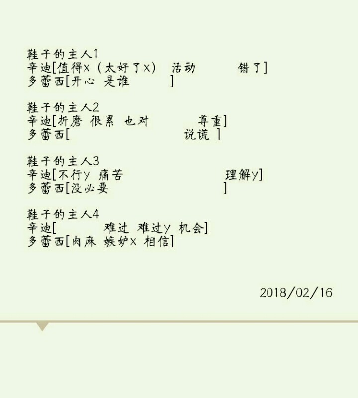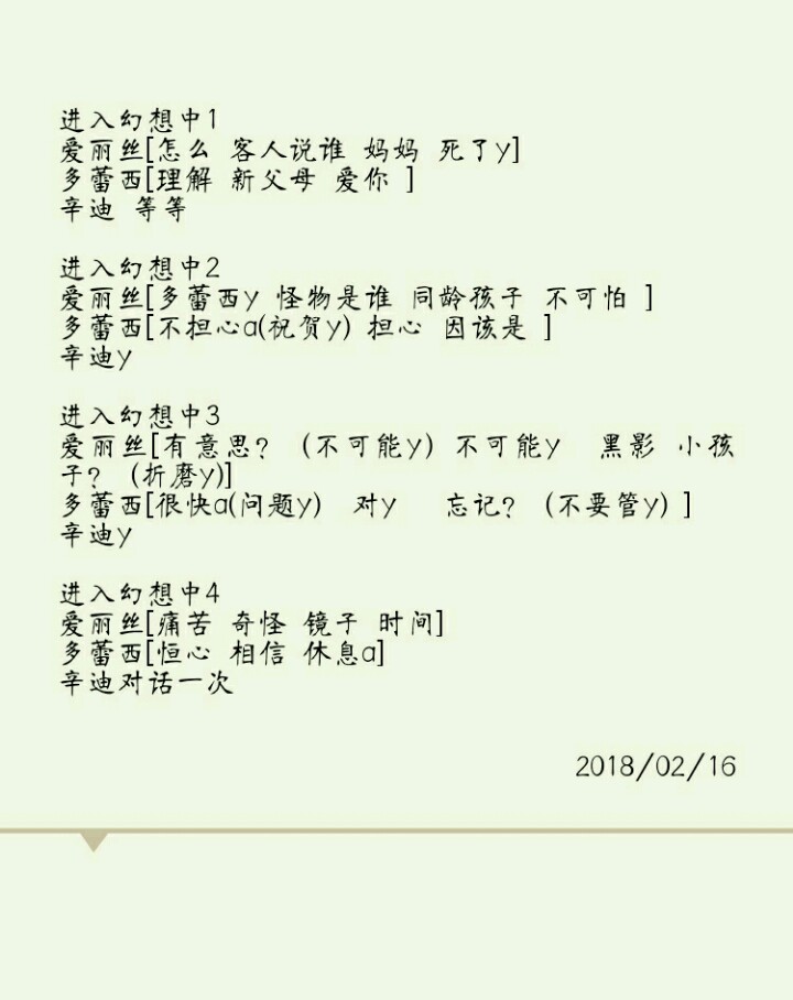 上面很多说过了怎么攻略我也是差不多这样的,稍微说下最好是把辛迪放到最后攻略吧,个人意见,因为辛迪真的非常好。 进入某人格的支线都是与这个人格对话以及与主人格对话,辛迪是有时候可以对话的,如果不是格雷特和爱丽丝的主场的话,最好不要碰。 假如某个人格整和度比较低可以在他的对话里面可能可以加到整和度的,尤其是辛迪……真的非常好加,自己看情况平衡一下压力和整和度,每个故事进行到最后一个就结局了,很容易很容易抑郁的。 还有一个是对话适可而止,如果后面没有什么有利的选项选了就是错,那么不妨退出对话。 我发现好像就是可以,比如鞋子的主人进去然后对话几句就退游戏,再打开继续游戏有几率进入其他线,看情况利用这个吧。 攻略放下面吧,自己写的一个……因为翻了很久没翻到自己摸索的。 注明:①每个选项被我摘选了其中的一个词来代表这个选项,比如:醒醒啊格雷特,我会简称为醒醒……打字方便。 ②[]括号内是第一个选项第二个选项依次类推,每个选项之间空格符号为一到两个空格,如果看见有长空格,说明这个选项要么是怎么选都有问题,要么是我没选出来……自己选吧,大部分应该都有。 ③选项末尾出现的字母含义是这个选项不是最佳选项,我对最佳选项的定义是:压力降低↓整和度上升↑,或者是什么情况都没有。 y 压力上升↑ a 爱丽丝整和度下降↓ g 格雷特整和度下降↓ x 辛迪整和度下降↓ ④多萝西我有时候打错了就变成多蕾西,格雷特就是葛雷特。翻译跟手机输入法默认好打的不一样……我就没那么严谨。