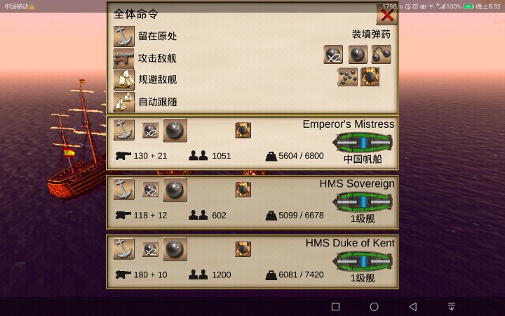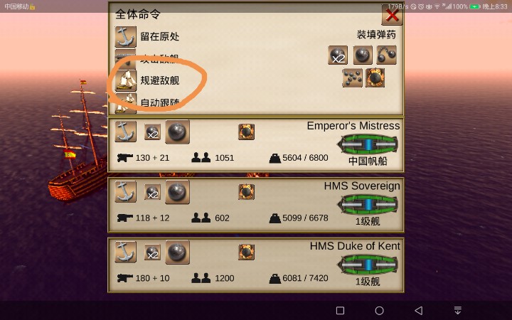 通过收集图纸,如果你嫌太麻烦,也可以抢一艘,不过最好让其他船都切换成规避模式(抢一级舰起码要3,4艘船)然后自己用链弹把对面的船帆打烂再用霞弹把对面船员打的差不多死光了之后,就可以让你的舰队围过来打登船战了。如图,图一这个就是舰队的选项表,图二是规避敌舰的选项。另外注意躲避一级舰的火炮,打人很疼的,小船直接沉