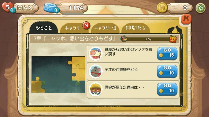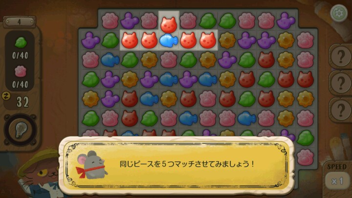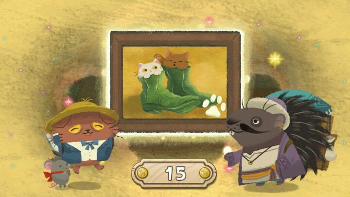 ●过关连连看还能获取灵感拼图——完成拼图老猫就会大叫一声:有了!然后刷刷刷,大作完成,得意洋洋地被小老鼠夸赞一番,卖与商人,赚猫币,同时解锁图鉴(画廊那里)。