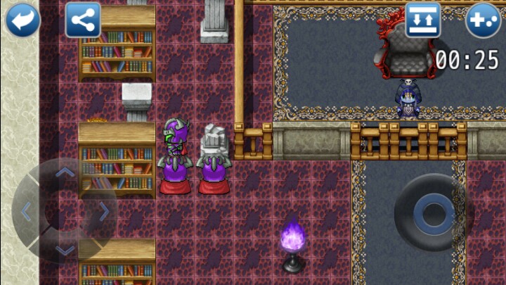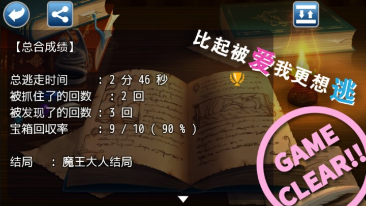 第五关打法:躲避追捕50秒!只要藏在有石头的书架后面等待50秒时间结束即可通过本关!如图一!(在此说一下物品的收集:第一个左边书桌上拿到魔王的信;第二个右上角的床旁边的柜子那里拿到魔王的枕头;第三个大概就是右下角的那个灰色的小熊吧!