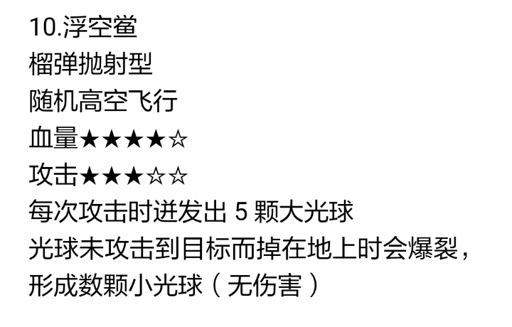 怪物篇 (ps.多数名称都是肾自己拟定的,凑合凑合看吧) 1.蜜蜂 有精英形态 直线弹道型 随机高空飞行 血量★★☆☆☆ 伤害★★☆☆☆ 无特点 2.地坑 无精英形态 榴弹抛射型 地面固定 血量★★★☆☆ 输出★★☆☆☆ 攻击时有两种攻击模式(随机) 发射一颗子弹,射程较远,有一定方向性 发射三颗子弹,射程较近,无明确方向性 3.电磁炮 有精英形态 直线弹道型 随机高空飞行 血量 ★★★☆☆ 输出 ★★★☆☆ 无特点 4.骨龙 无精英形态 榴弹爆射型 地面固定 血量★★★★☆ 输出★★★★☆ 背部有一定装甲 具有方向性,不能攻击背后目标 持续攻击,无论有无目标 攻击时有两种攻击模式(随机) 发射较少的子弹,前置动作、攻击后冷却较快 发射较多的子弹,前置动作、攻击后冷却较慢