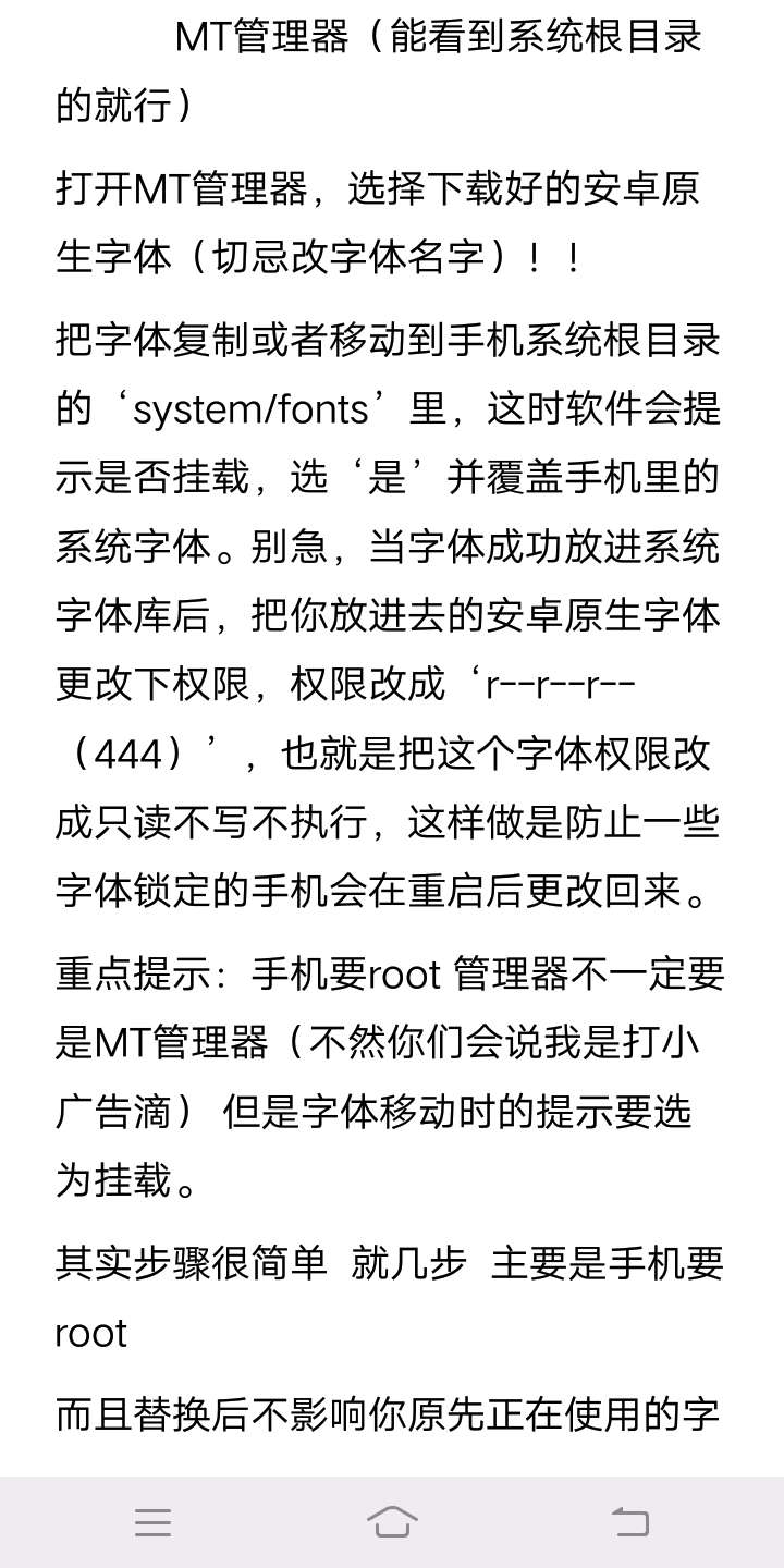 2.把下载好的安卓出厂字体移到system/fonts文件夹里这时软件会提示是否挂载,选‘是’并覆盖手机里的系统字体。别急,当字体成功放进系统字体库后,把你放进去的安卓原生字体更改下权限,权限改成‘r--r--r--(444)’,也就是把这个字体权限改成只读不写不执行,这样做是防止一些字体锁定的手机会在重启后更改回来。