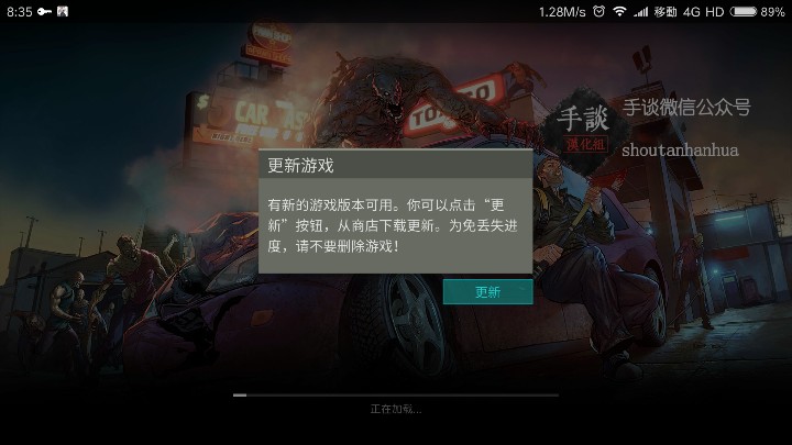 如果你成功进入游戏显示了那个拿着斧子躲在车后的屏幕后,闪出一个弹窗(有一个update的按钮),说明你要想办法更新,如果你在游戏中被提示强制更新,道理同上。