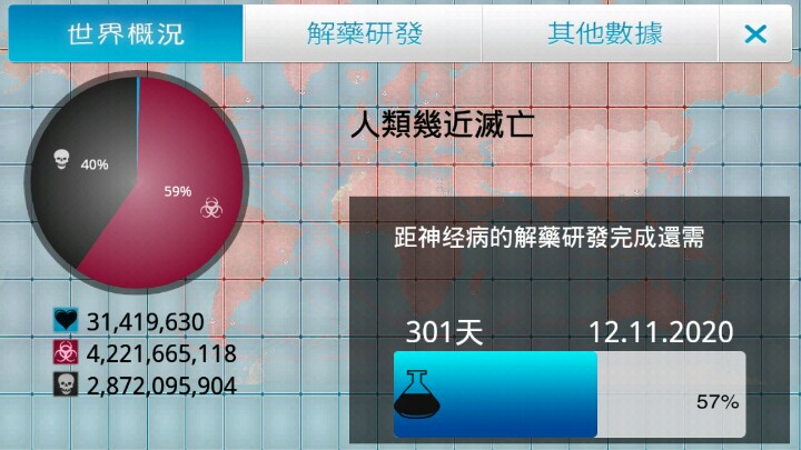 3.红泡加成:在基数外的加成与病毒严重性和国家感染优势呈对数关系,一般而言对严重性,以满条为100,严重性小于10仅加成基数1点,10到20间加成2点,20-50加成3点,50以上加成4点,再算上感染优势,一个红泡最多可加6点左右。