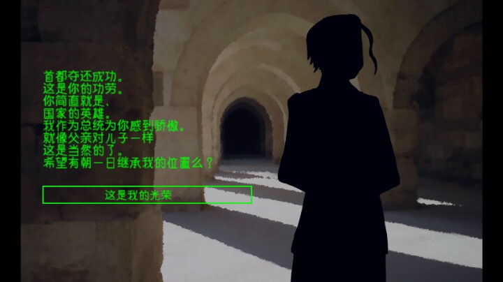 帮助总统夺回首都之后,国家恢复了和平。总统单独召见了你。对话之后,你就game over了… 见图