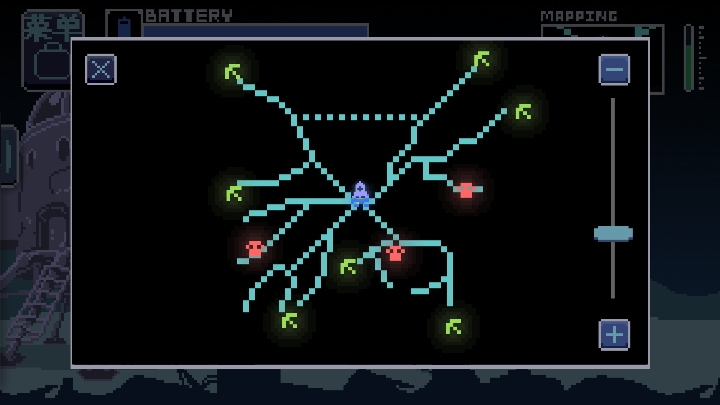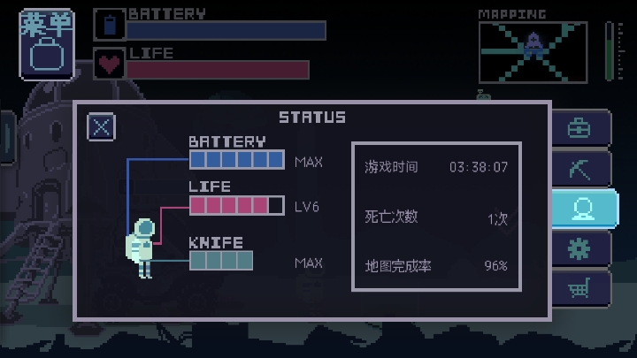 路痴的请注意,这里有小可爱把地图献上给你们标记有黄色小圆块的代表找到队友尸体的地方(队长估计被瘦长鬼影消化了),红色骷髅代表有怪的地方,有绿色锄头的地方代表有矿山或者星草生长地,大地怪守护者一大片星草接下来给新手几个建议1前期探索的时候走路一定要走到头!一定要走到头!!!就算你看到路的尽头是岩石也要走完,不然后期你就得和我一样看着地图显示百分之九十九然后默默的走完整个地图去找那不知道漏到哪里的百分之一.....2虽说游戏教程说在极端温度下,电池消耗量会增加还是怎样,但实际上只有在下小雪的场景下电池消耗速度会加快,而且是非常快,所以防寒试剂很重要,其余在暴雪和炎热地区消耗反而比平常更少。3建议前期没拿到激光枪装备没升到五级以上的千万不要去惹怪,尤其是瘦长鬼叔!!!去打他一定要带资源而且生命满级不然你死的飞快,前期看到他转身就跑也是没有生命危险,至于另一个大地怪还是很好打的激光枪带几个电源嗖嗖几下就搞定了,都不用消耗生命。还有它是有三次复活机会的不要方不要方