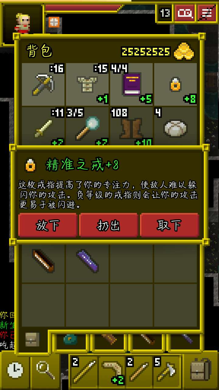 神射之戒这个版本很强,可以加投掷武器的攻击和耐久,而且加成伤害很高(见下图),前期扔几下就死一个怪。可以说,怪根本无法近身(会被近身纯属个人操作问题・_・)。前期一直苟,苟到打过天狗转职狙击手后直接发达,再加上六级(最少)神射之戒,矿场基本吊打,高伤害,射速快,而且有破甲,基本两个投矛死一只怪。后期20+的楼层主要靠高阶投掷武器:三叉戟、飞斧、投掷锤……