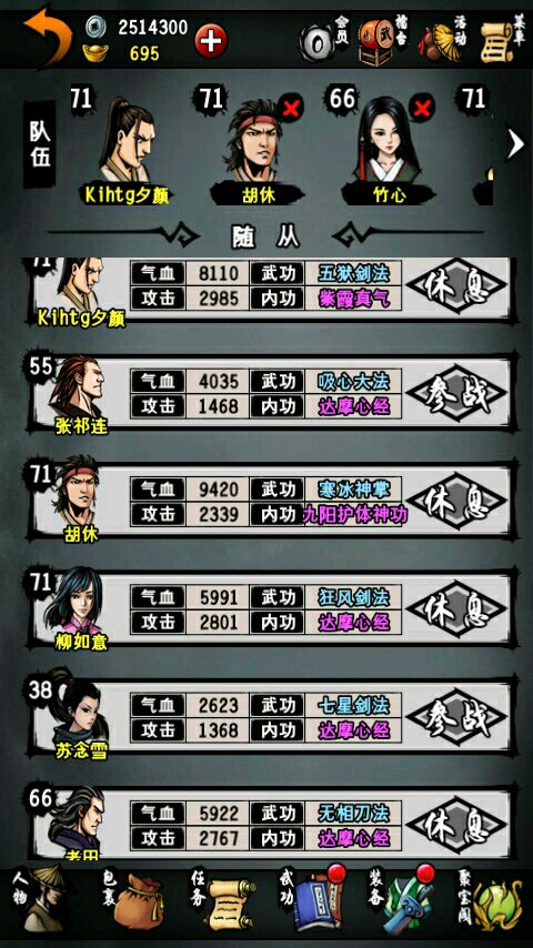 本人主线到成都扬先生。地宫只到默君。紫霞只拿了一本。好了直接进入主题。这游戏要玩到后期很难。我们要选男主角。职业刀。人生目标选武功。最后平民。先说成员的选择。最多血量的胡修,补师如意,江湖第一人宗泽,刀客老田,第一控场竹心和成长值都不错的清舞。武功方面。主角,宗泽和老田用无相刀法。如意五狱。胡修寒冷。竹心大阴阳手。清舞铁掌功(最后七绝拳)。内功方面,紫霞两本一定要拿!一本给主角,一本给老田,九阳给胡修,其他人都用达摩。装备方面,主角和老田用无相刀(造速度)。泽用非攻刀(造吸血)。如意东瀛剑(造格挡)。胡修、竹心和清舞用玄蛇(造免伤)。衣服全部都用金刚咖沙。护腕都用赤文。 戒指用寒冰。其他的通通都不要用。免伤才是最实际的!希望对大家有帮忙。