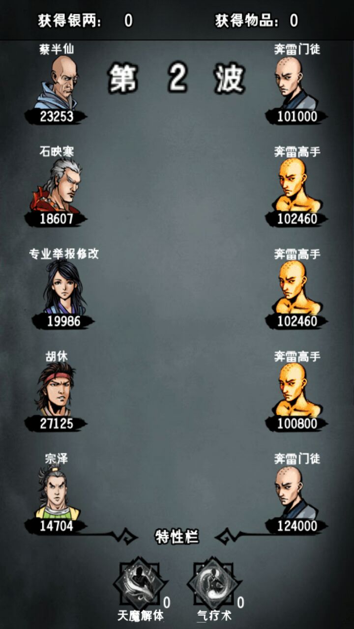 本人主线到成都扬先生。地宫只到默君。紫霞只拿了一本。好了直接进入主题。这游戏要玩到后期很难。我们要选男主角。职业刀。人生目标选武功。最后平民。先说成员的选择。最多血量的胡修,补师如意,江湖第一人宗泽,刀客老田,第一控场竹心和成长值都不错的清舞。武功方面。主角,宗泽和老田用无相刀法。如意五狱。胡修寒冷。竹心大阴阳手。清舞铁掌功(最后七绝拳)。内功方面,紫霞两本一定要拿!一本给主角,一本给老田,九阳给胡修,其他人都用达摩。装备方面,主角和老田用无相刀(造速度)。泽用非攻刀(造吸血)。如意东瀛剑(造格挡)。胡修、竹心和清舞用玄蛇(造免伤)。衣服全部都用金刚咖沙。护腕都用赤文。 戒指用寒冰。其他的通通都不要用。免伤才是最实际的!希望对大家有帮忙。
