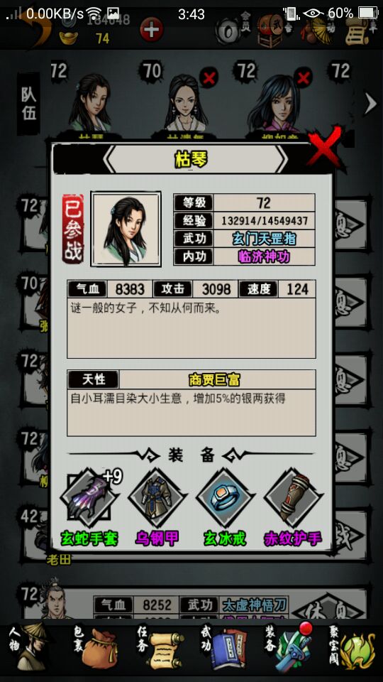 本人主线到成都扬先生。地宫只到默君。紫霞只拿了一本。好了直接进入主题。这游戏要玩到后期很难。我们要选男主角。职业刀。人生目标选武功。最后平民。先说成员的选择。最多血量的胡修,补师如意,江湖第一人宗泽,刀客老田,第一控场竹心和成长值都不错的清舞。武功方面。主角,宗泽和老田用无相刀法。如意五狱。胡修寒冷。竹心大阴阳手。清舞铁掌功(最后七绝拳)。内功方面,紫霞两本一定要拿!一本给主角,一本给老田,九阳给胡修,其他人都用达摩。装备方面,主角和老田用无相刀(造速度)。泽用非攻刀(造吸血)。如意东瀛剑(造格挡)。胡修、竹心和清舞用玄蛇(造免伤)。衣服全部都用金刚咖沙。护腕都用赤文。 戒指用寒冰。其他的通通都不要用。免伤才是最实际的!希望对大家有帮忙。