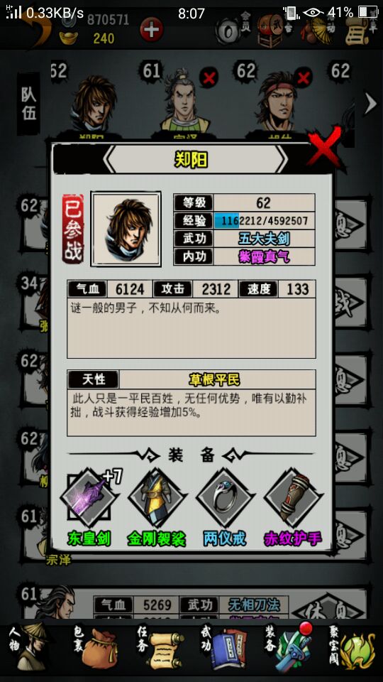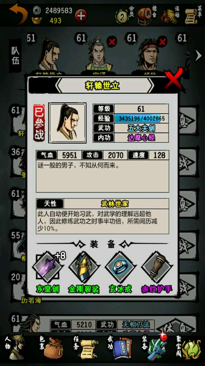 本人主线到成都扬先生。地宫只到默君。紫霞只拿了一本。好了直接进入主题。这游戏要玩到后期很难。我们要选男主角。职业刀。人生目标选武功。最后平民。先说成员的选择。最多血量的胡修,补师如意,江湖第一人宗泽,刀客老田,第一控场竹心和成长值都不错的清舞。武功方面。主角,宗泽和老田用无相刀法。如意五狱。胡修寒冷。竹心大阴阳手。清舞铁掌功(最后七绝拳)。内功方面,紫霞两本一定要拿!一本给主角,一本给老田,九阳给胡修,其他人都用达摩。装备方面,主角和老田用无相刀(造速度)。泽用非攻刀(造吸血)。如意东瀛剑(造格挡)。胡修、竹心和清舞用玄蛇(造免伤)。衣服全部都用金刚咖沙。护腕都用赤文。 戒指用寒冰。其他的通通都不要用。免伤才是最实际的!希望对大家有帮忙。