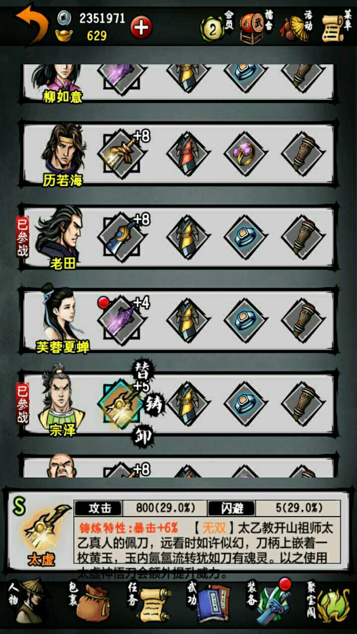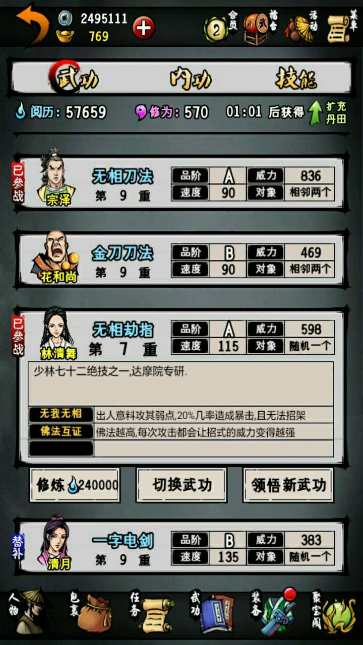 本人主线到成都扬先生。地宫只到默君。紫霞只拿了一本。好了直接进入主题。这游戏要玩到后期很难。我们要选男主角。职业刀。人生目标选武功。最后平民。先说成员的选择。最多血量的胡修,补师如意,江湖第一人宗泽,刀客老田,第一控场竹心和成长值都不错的清舞。武功方面。主角,宗泽和老田用无相刀法。如意五狱。胡修寒冷。竹心大阴阳手。清舞铁掌功(最后七绝拳)。内功方面,紫霞两本一定要拿!一本给主角,一本给老田,九阳给胡修,其他人都用达摩。装备方面,主角和老田用无相刀(造速度)。泽用非攻刀(造吸血)。如意东瀛剑(造格挡)。胡修、竹心和清舞用玄蛇(造免伤)。衣服全部都用金刚咖沙。护腕都用赤文。 戒指用寒冰。其他的通通都不要用。免伤才是最实际的!希望对大家有帮忙。