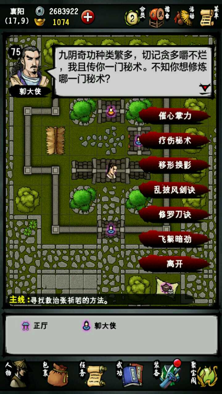 本人主线到成都扬先生。地宫只到默君。紫霞只拿了一本。好了直接进入主题。这游戏要玩到后期很难。我们要选男主角。职业刀。人生目标选武功。最后平民。先说成员的选择。最多血量的胡修,补师如意,江湖第一人宗泽,刀客老田,第一控场竹心和成长值都不错的清舞。武功方面。主角,宗泽和老田用无相刀法。如意五狱。胡修寒冷。竹心大阴阳手。清舞铁掌功(最后七绝拳)。内功方面,紫霞两本一定要拿!一本给主角,一本给老田,九阳给胡修,其他人都用达摩。装备方面,主角和老田用无相刀(造速度)。泽用非攻刀(造吸血)。如意东瀛剑(造格挡)。胡修、竹心和清舞用玄蛇(造免伤)。衣服全部都用金刚咖沙。护腕都用赤文。 戒指用寒冰。其他的通通都不要用。免伤才是最实际的!希望对大家有帮忙。