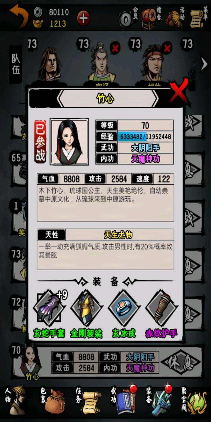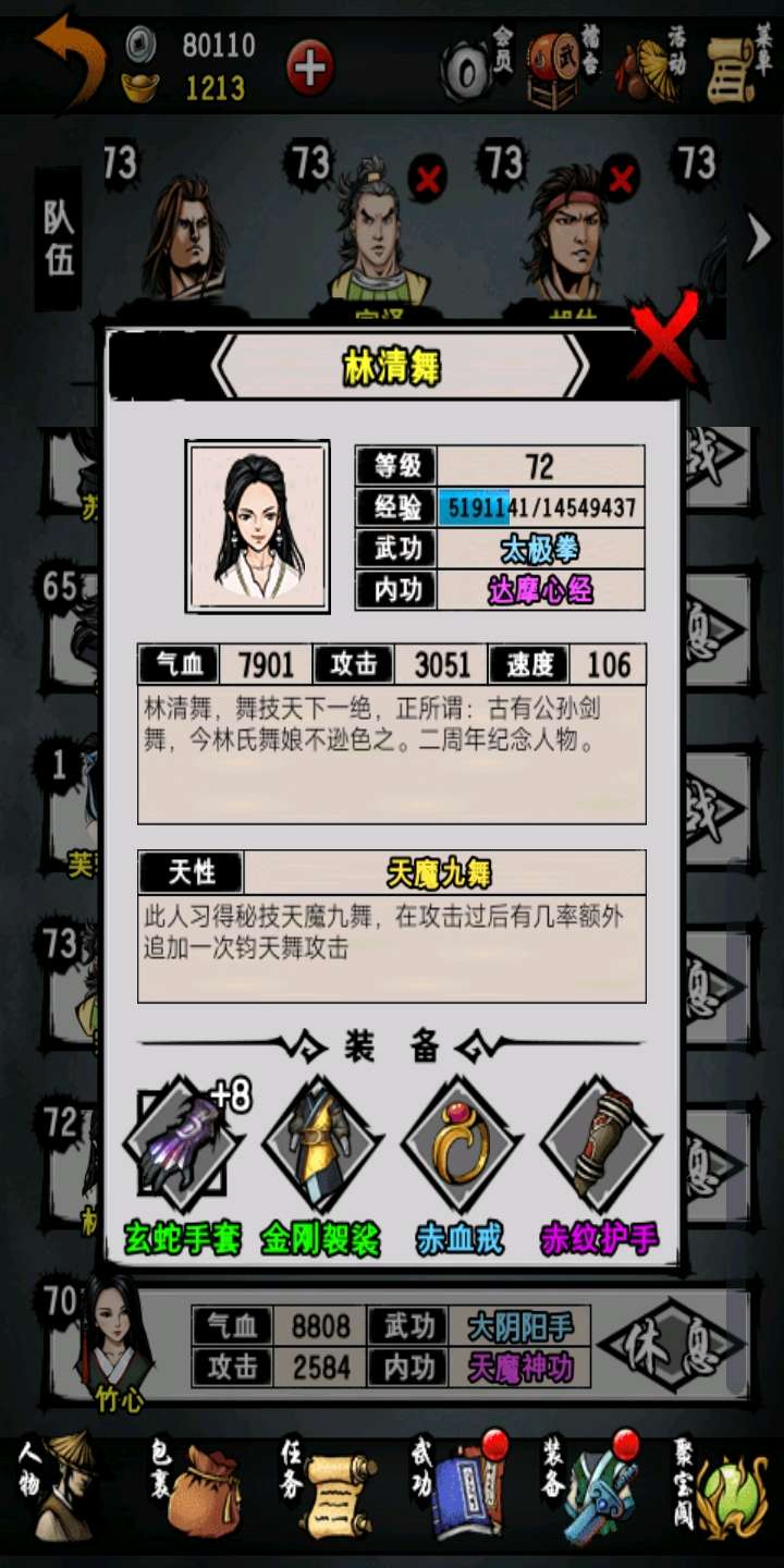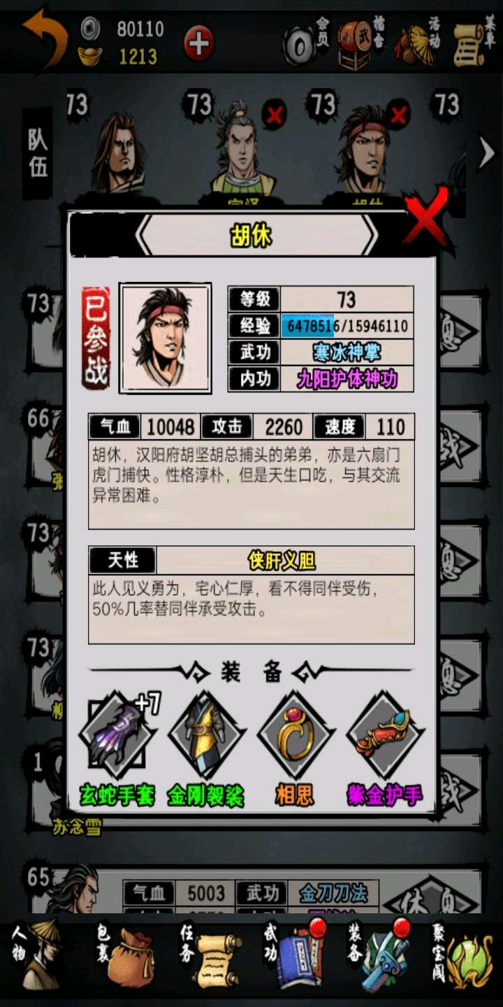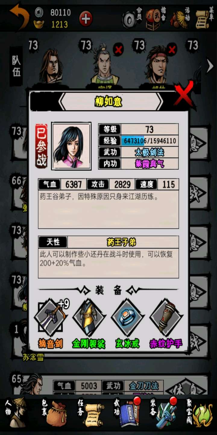 本人主线到成都扬先生。地宫只到默君。紫霞只拿了一本。好了直接进入主题。这游戏要玩到后期很难。我们要选男主角。职业刀。人生目标选武功。最后平民。先说成员的选择。最多血量的胡修,补师如意,江湖第一人宗泽,刀客老田,第一控场竹心和成长值都不错的清舞。武功方面。主角,宗泽和老田用无相刀法。如意五狱。胡修寒冷。竹心大阴阳手。清舞铁掌功(最后七绝拳)。内功方面,紫霞两本一定要拿!一本给主角,一本给老田,九阳给胡修,其他人都用达摩。装备方面,主角和老田用无相刀(造速度)。泽用非攻刀(造吸血)。如意东瀛剑(造格挡)。胡修、竹心和清舞用玄蛇(造免伤)。衣服全部都用金刚咖沙。护腕都用赤文。 戒指用寒冰。其他的通通都不要用。免伤才是最实际的!希望对大家有帮忙。