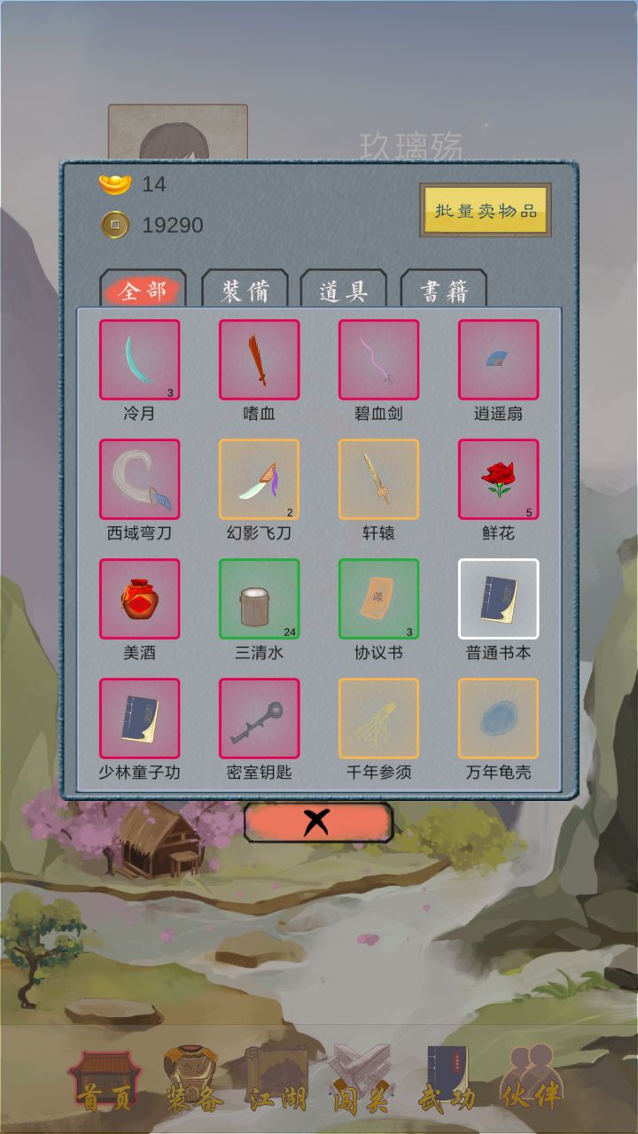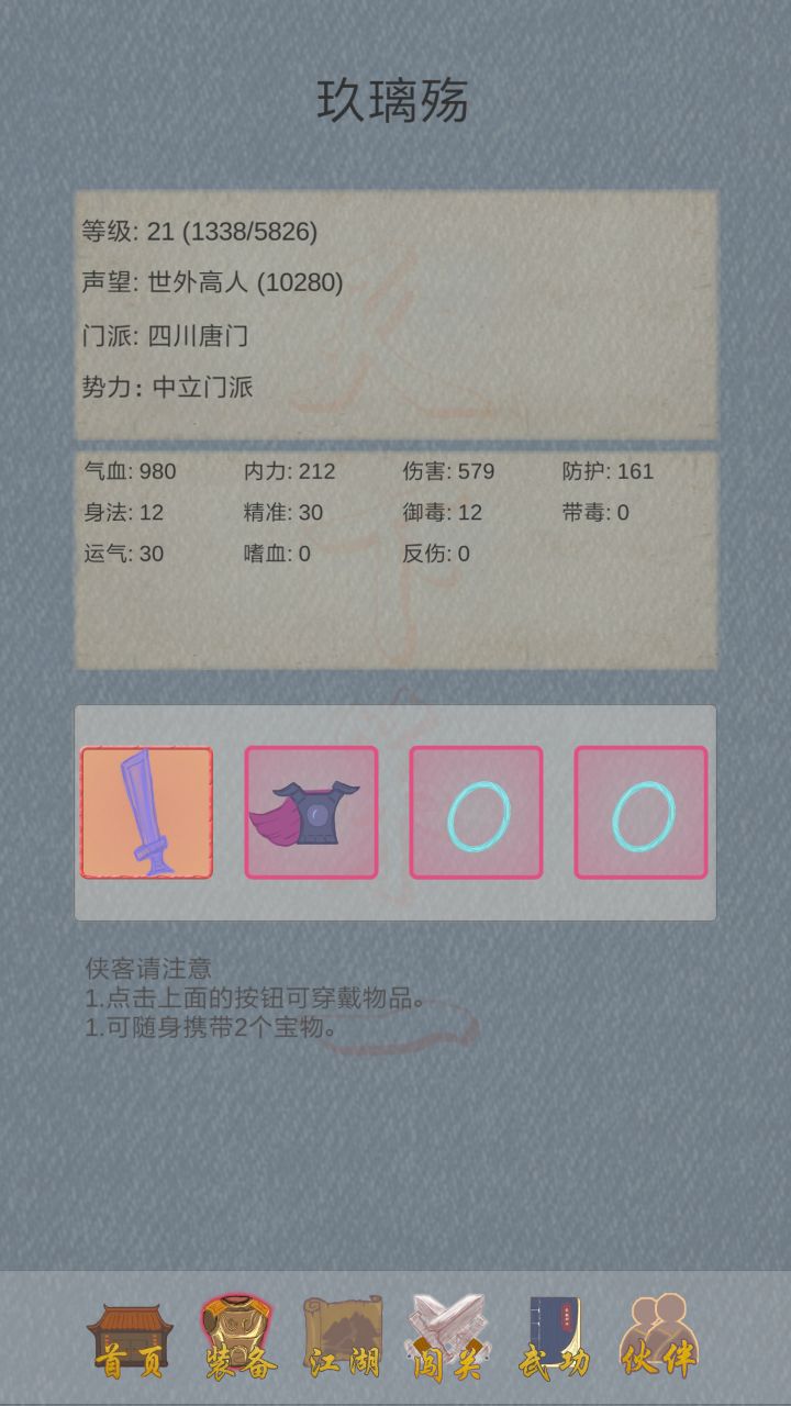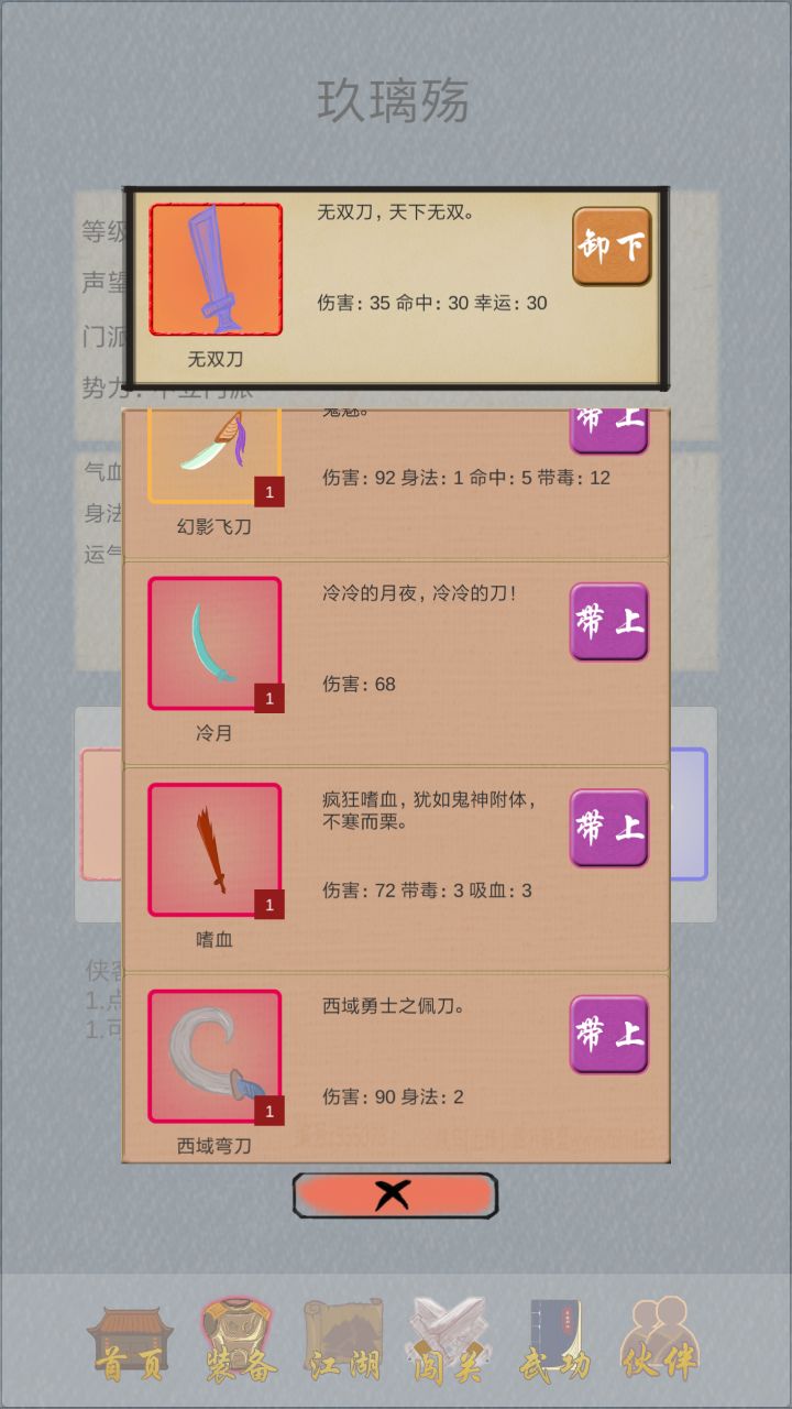 首先游戏里面有几个身份可以选择,不同身份可能故事中掉落的道具不一样,能够学习的武功不一样,但是都有共同点,就是终极武功无双功,以及最强神器无双刀,尽管我打到了很多属性比这把刀强的,但是换上过后加的各种属性都没有无双刀高