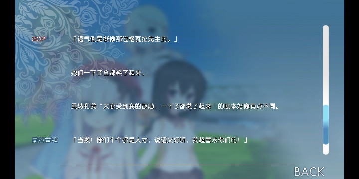 游戏最大看点是个人线的恋爱情节,和紧张刺激的拯救女主的过程中同时收获异常的感动,但在旋律时而优美伤感时而妙趣横生BGM和表情活灵活现的人物立绘上更是水出芙蓉,在同类galgame中脱颖而出。Galgame毕竟是文字游戏,若说画面旖旎与否决定其下限,文案的好坏则决定其上限,但显然本作的文案确实上乘之作,其中"孔乙己""真香""G胖"等等梗运用得让人不至于跳戏,就像欧·亨利的短篇小说结局一样,既在意料之外,又在情理之中