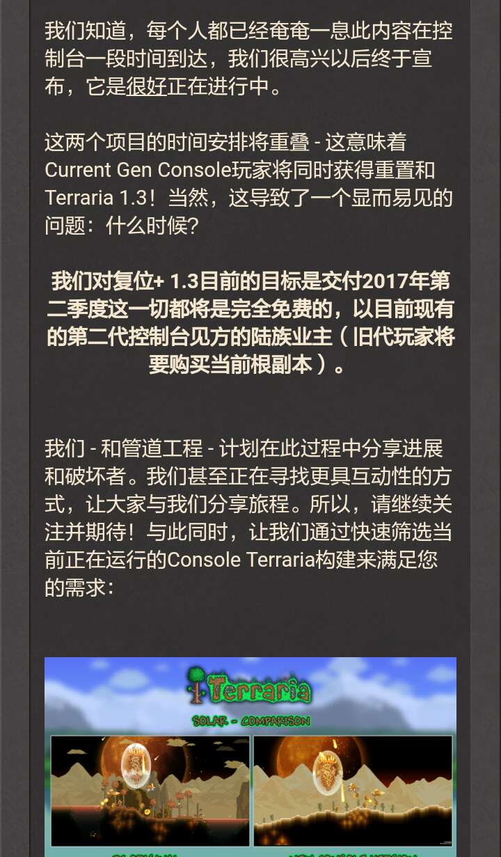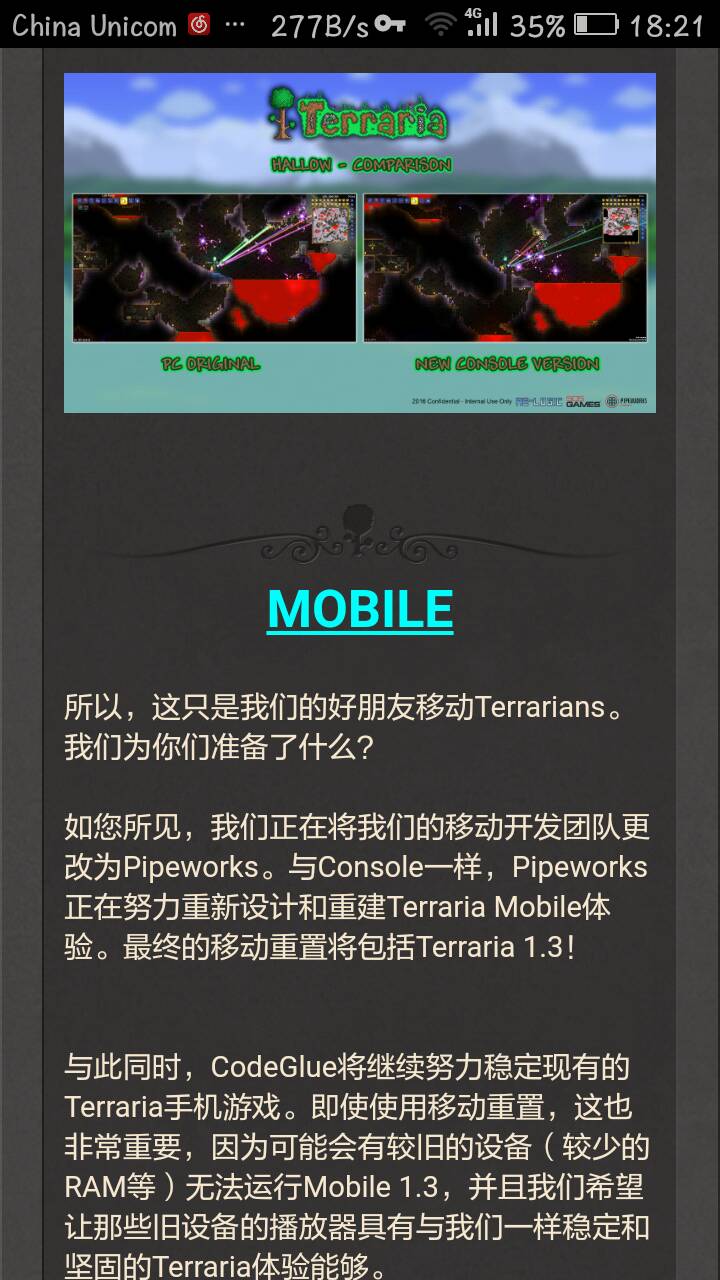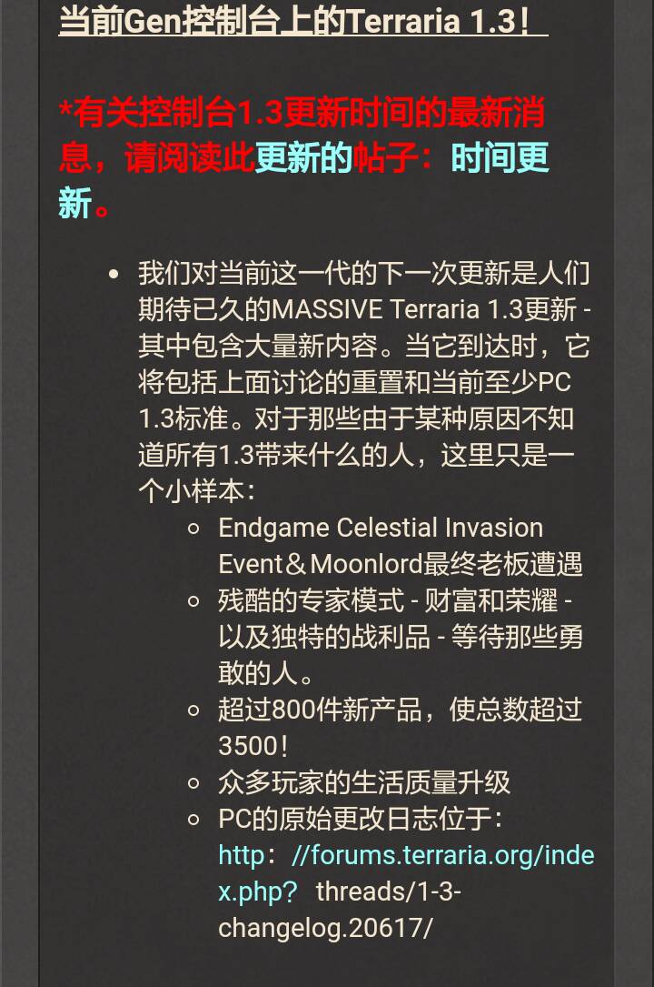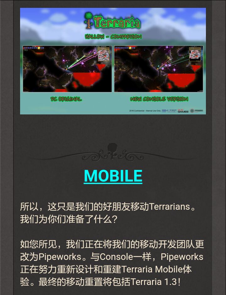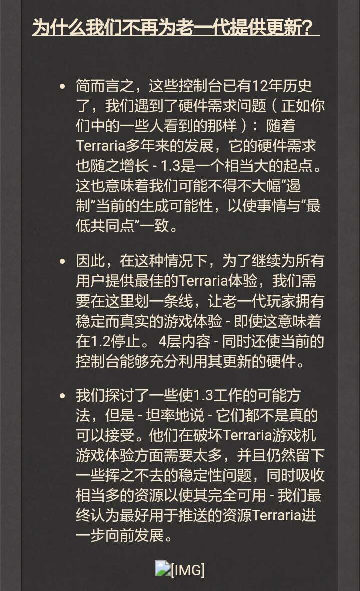 刚翻'墙出去看了看|・ω・`),嗯~2016年的帖子,说是更新PS4和XBOX ONE,而PSV、XBOX 360和PS3都留到了PC版的1.2.4.1(伤心,前几天买了PSV版泰拉瑞亚啊!ಥ_ಥ),还有个帖子说如果更新了手机版将不再单机游玩,必须联网!.._:(´_`」 ∠):_ …原因是→_→手机储存不行,创建的世界直接保存到云端,而且只能创建小世界(有句mmp要讲)图片我去找回来,浏览时没截图(›´ω`‹ )