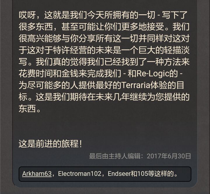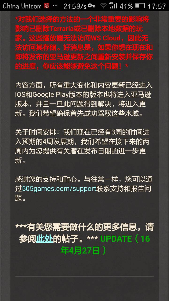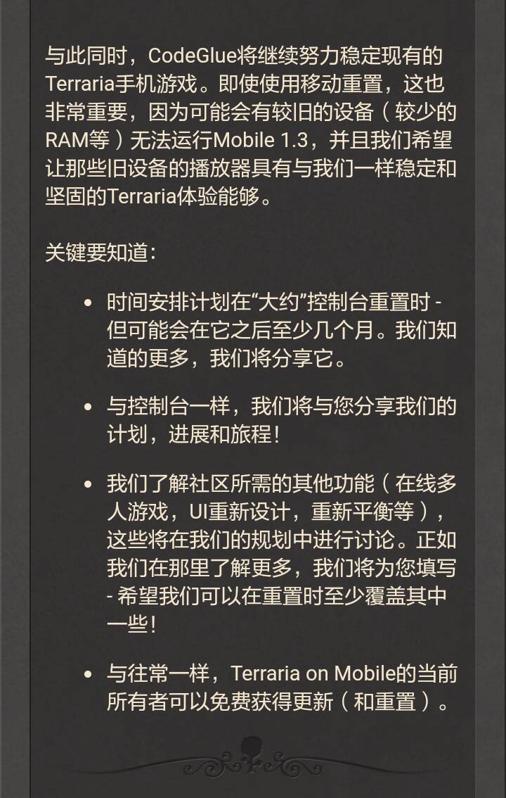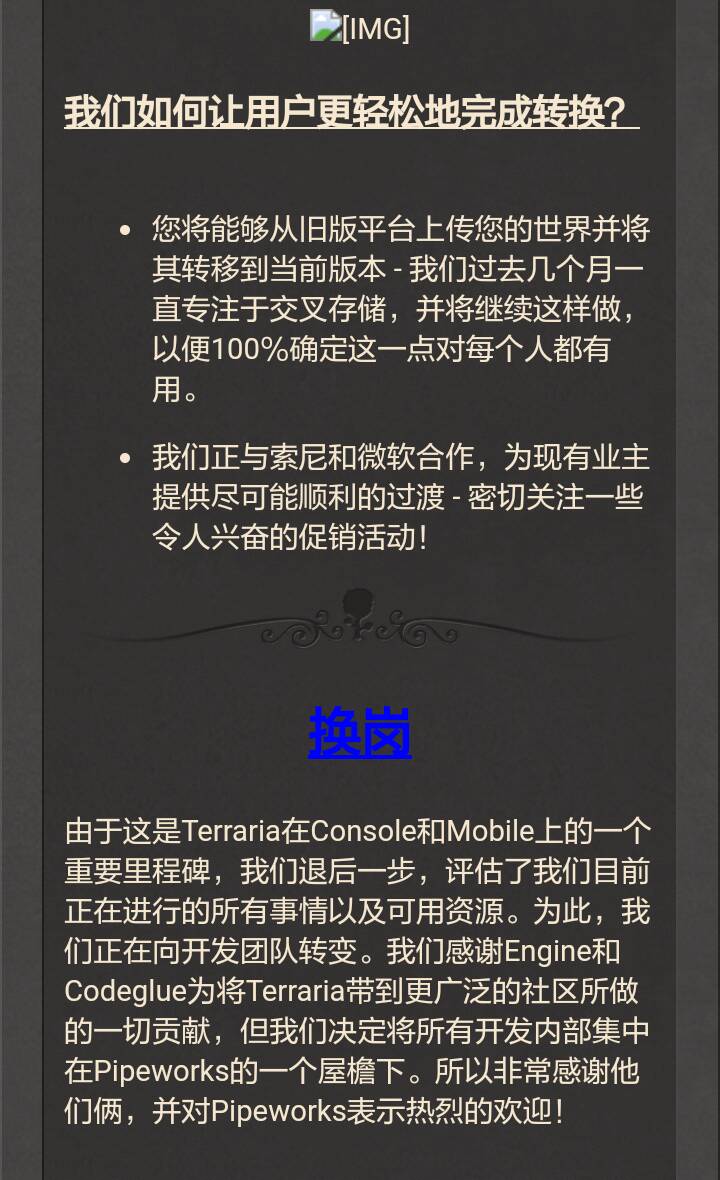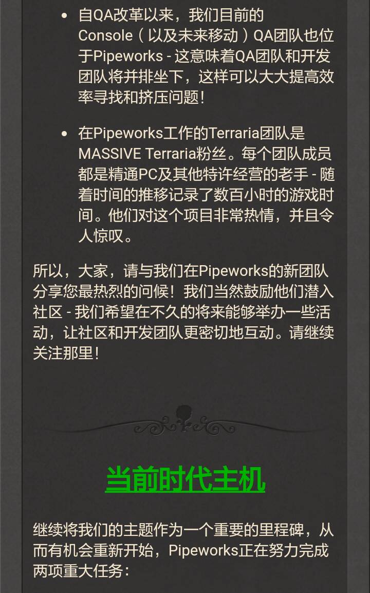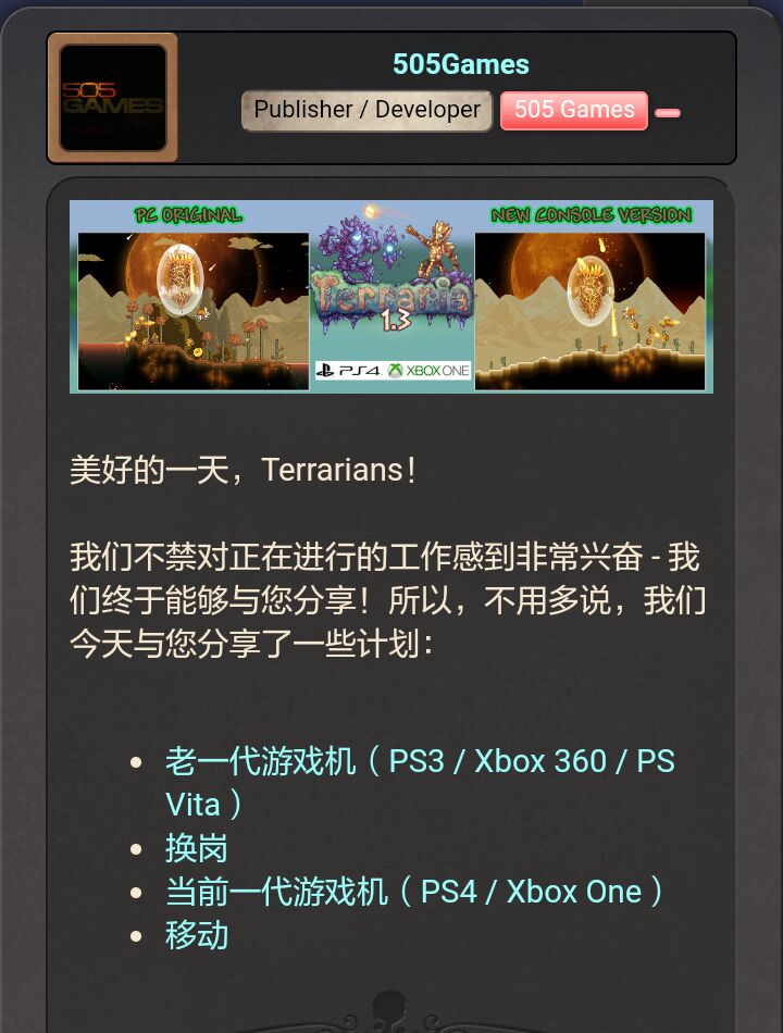 刚翻'墙出去看了看|・ω・`),嗯~2016年的帖子,说是更新PS4和XBOX ONE,而PSV、XBOX 360和PS3都留到了PC版的1.2.4.1(伤心,前几天买了PSV版泰拉瑞亚啊!ಥ_ಥ),还有个帖子说如果更新了手机版将不再单机游玩,必须联网!.._:(´_`」 ∠):_ …原因是→_→手机储存不行,创建的世界直接保存到云端,而且只能创建小世界(有句mmp要讲)图片我去找回来,浏览时没截图(›´ω`‹ )