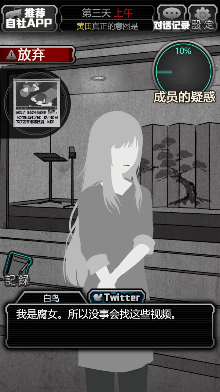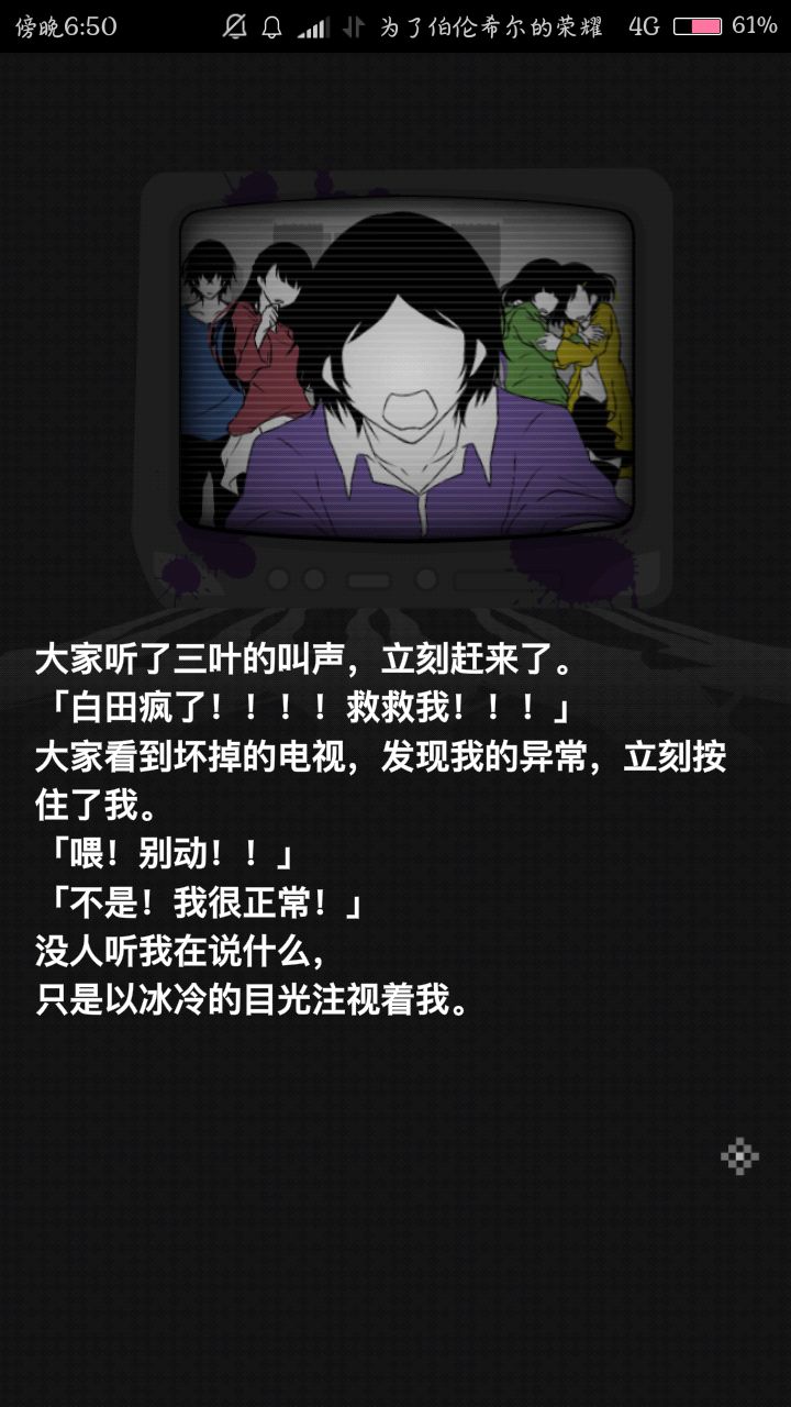太可爱辽白田!对着茜就一个劲的撒娇哈哈哈哈白田对茜就一痴汉,茜像姐姐一样!还会让白田拿枕头到房间哄睡觉。主要是还真的去拿了。(白田痴汉正解。还有就是对蓝川总会有个“咿”这个也太可爱了吧!蓝白真好磕。而且一点情商都没有,对待小三叶温柔一点都不行嘛|・ω・`)不过白田是真的很珍视这个家啊,这种情况也是在意地板有没有坏掉。有几个结局能看出来白田对这个家的眷念的。“这里可是我的家啊……”那时候看到这个真的是感动死了!白田超可爱!是很认真的把同伴当做家人啊。(但是是个监视别人的死痴汉。)