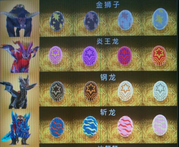 炎王龙蛋和麒麟蛋的花纹是一样的,就是颜色变成了红色,金狮蛋和青熊蛋花纹一样,颜色是黑加黄