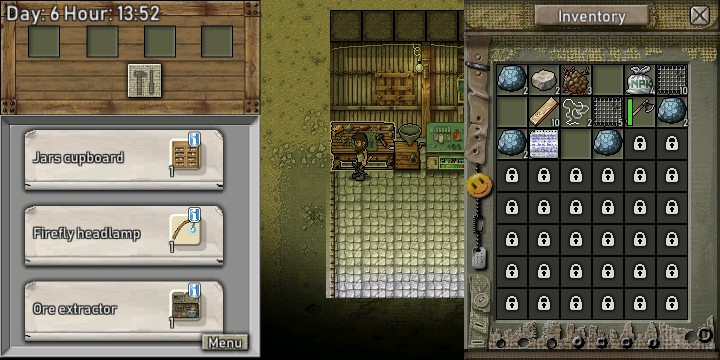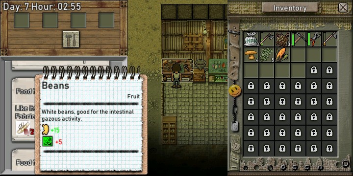 住:在家中的功能单位一共有六个(不算箱子和柜子,不知道为什么你们都管柜子叫冰箱,你们连最基本的日式校园动漫都没看过吗?那种柜子明明很常见的啊喂!)分别为工作台(功能最大,几乎全部物品都是在工作台上制作的,包括修理工具),化学架(几乎没用,至少我还不知道有什么用),屠宰台(用于野生动物的屠宰和剥皮),床(睡觉回精力),水桶(这可不是无尽酒壶啊,只有五千单位的水是给你没有雨的时候用的!)除此之外我们还需要在工作台上建造的必要设施有:种子机(开局的玉米不是给你吃的,是让你做成种子种的!)水桶(游戏会在第二天夜里准时下雨,雨水基本是这个游戏整个水的来源,桶最好做三个以上,别忘了你是个农民)堆肥桶(五个有机物放进堆肥桶里一段时间后变成化肥,化肥可以把普通的地变成可耕种土,这个很重要)柜子(我就不信初始给你的一柜一箱就够你用的눈_눈)大概就是这些