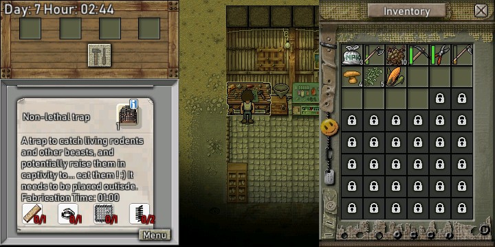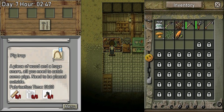 工作台上第三列里的这三个分别是鼠夹,鸡笼,猪陷阱,需要配上相应的私聊才能使用(貌似)除了老鼠的要求比较低,只需要干草和玉米之外鸡和猪的要求都比较高,一个要豆子,一个要白萝卜,所以。。。前期还是老老实实种菜,当个废土农民吧