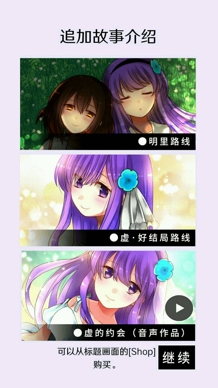 第二个彩蛋是真结局后返回标题前,购买项中,有一段虚的约会音频。鄙人听不懂日语,听得懂的小伙伴能告知一下么。(´;︵;`)