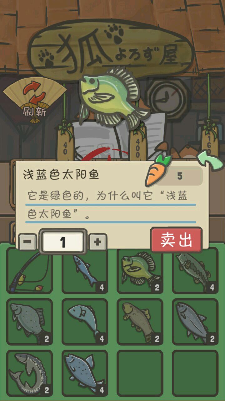 回家会看到一颗大萝卜树,看看广告赚肥料 点击肥料袋施肥加快我们的萝卜树成长,还可以点击房间里的钓鱼竿(前面买的)去钓鱼,等月兔头顶出现感叹号就点击,可能是各种种类的鱼,也可能是恶臭的鞋子和空瓶子,我一开始还想着能不能烤了吃哈哈哈,但是我发现不可以[滑稽]我们可以去便利店售卖这些东西,鞋子和瓶子都是一元/个,鱼都是十元或五元/条
