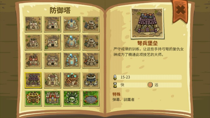 这塔的优点是射速快、范围大。升级老鹰技能还能增加附近防御塔的攻击范围。把弹幕点满伤害也是蛮可观的