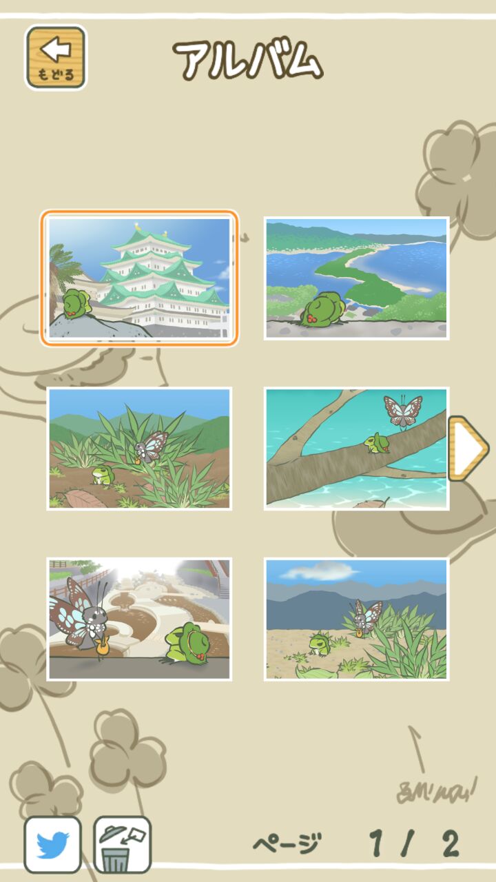 小青蛙真可爱啊~~~可惜大部分内容看不懂……以及玩起来真的非常放松,因为感觉都不能说是游戏,游戏性几乎为0,有趣的地方是对各地的特产的介绍(看不懂乐趣少一半)和旅行中的照片。