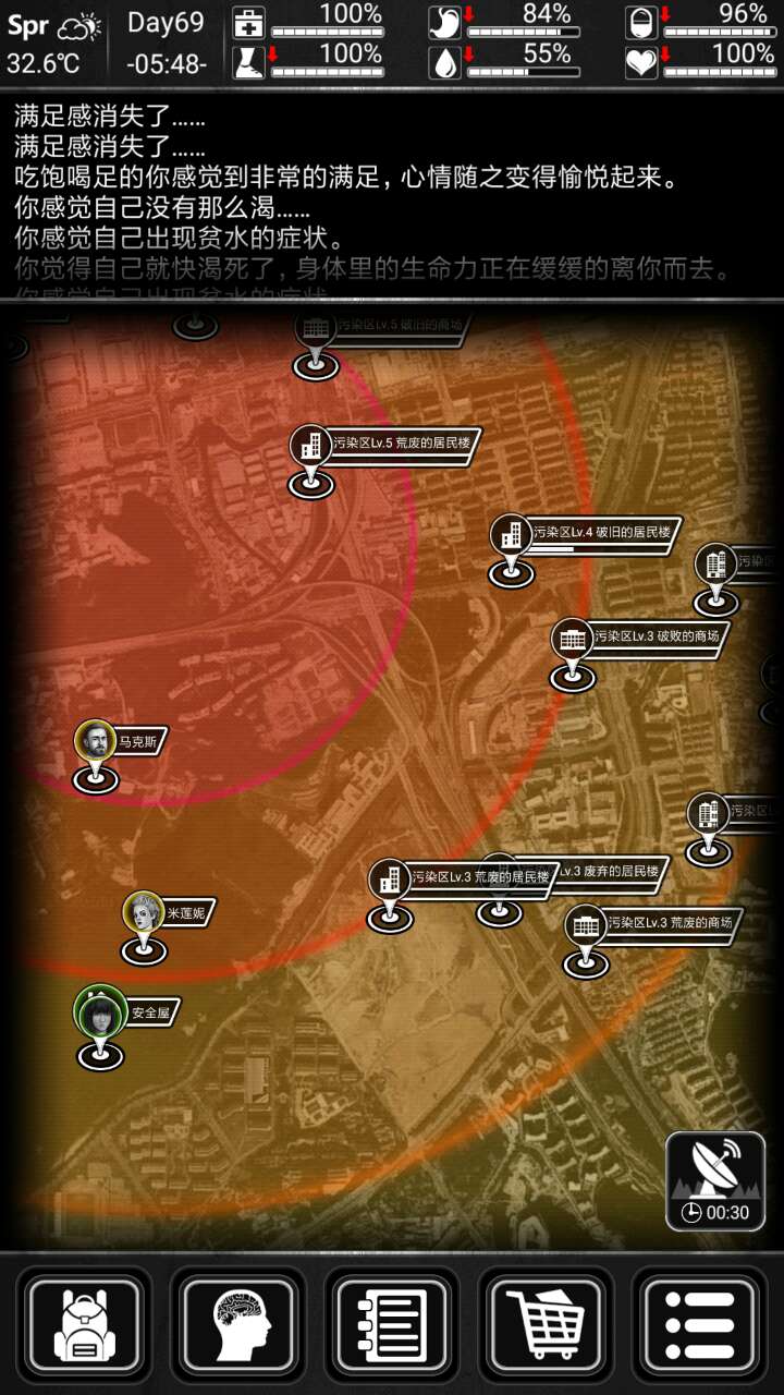 这款游戏可要比死亡日记简单多了,至少水资源根本不缺,甚至可以说是泛滥(我背包满了第一个扔的就是水),几天下来就已经攒了几十瓶饮用水了。食物的话,随便搜刮一个房子就能找到一两个,看一次广告也能得到一桶爆米花(虽然一次只加5点饥饿值),到了后期造出了温室,就可以自己种植农作物了。所以说这游戏里的食物其实也不难搞。然后就是它的自由度在同类型游戏中算是比较高的了,如果在房子里看到敌人,你可以选择绕开它们,不用像其它游戏那样必须要战斗消灭敌人才能继续玩。总体来说这款游戏还是相当不错的,喜欢这种文字冒险类游戏的玩家可以试试。