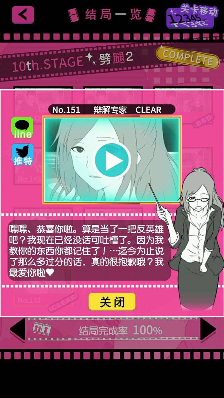 结局收集完毕!个人是先自己玩出clear结局,然后在一个一个按顺序选尽量把secret关卡打出来。玩到最后的时候突然觉得虽然global gear.k.k出的游戏大都三观不正,但是却总是能给我意想不到的感动。虽然男主又渣歌喉还惊世骇俗,可是女主就是那么喜欢他,无论是闺蜜还是女友2,都没有这样的喜欢。虽然老是质问他,有时候甚至会拳打脚踢,但是在每一关开场动画时都可以看得出来他们很恩爱。女主愿意为他下厨,也会为了他扮演他喜欢的愚蠢的女人,不看男主和其他女孩的纠缠真的觉得他和女主就像最普通的情侣一样,虽然会有争吵,但却仍然彼此相爱。女主真的是个可爱的妹子啊,这样的女孩值得拥有幸福。