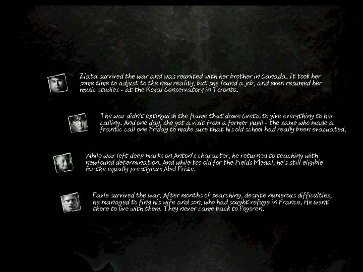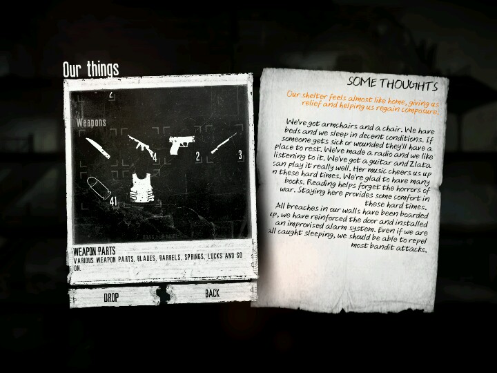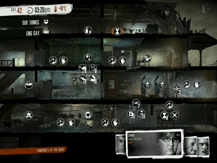 然后说说可玩性吧,背景是一群叛军被围在了Porogen打围城战,而你的目标是搜索足够的物资,在战争中活下去。第一次玩什么也不会,不知道什么时候该给人物吃饭,有些地图说明还受限于英文水平理解偏差然后进去GG。。Cveta(中文版圣母)描述是“Loves Children”然后傻乎乎的让他去了学校以为有特殊情节。。后面没控制好情绪,加上老被抢劫,崩溃了。后面就是好久没玩。