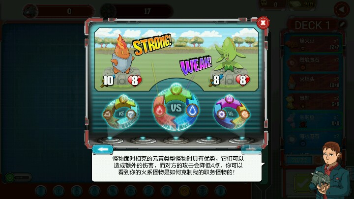 本来以为是对战,后来发现是卡牌,对战中卡牌进化,一上手还不错,后面从第31关起需要联网解锁全地图,前三十关不去商店买新的蛋不会得到比较高级的怪兽,会比较难打。打法分享:a.限时生存关卡,尽量的多放些怪兽帮你抵挡伤害,尽量进化;b.击败对方关卡,猜属性,一开始可以用两种不同属性怪兽试探,然后尽量进化,高级怪兽伤害可观;c.限时击败关卡,多放伤害高的上场,堆伤害。里面内容其实挺丰富的,可惜涉及到需要联网,版本好像有问题,一联网就有奇葩问题,有兴趣玩的老铁请先禁止该游戏联网就可以进去探索,总的说,这一切一定是小编搞的鬼→_→