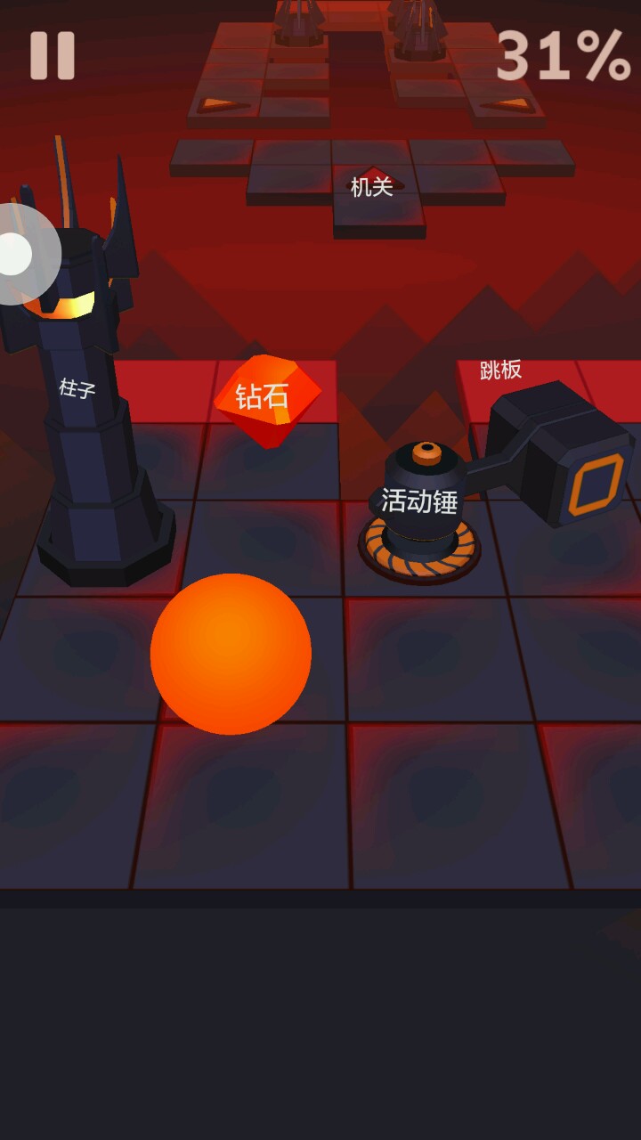 首先,球球会一直往前走,你的任务就是左右移动避免障碍。如图所示,障碍有好几种,常见的有突然从地面冒出来的柱子,不断原地转圈的锤子,踩了才有路的三角形机关,以及图上没有的发射光柱的炮台等等,前方的路都在不停变化,一个不小心,就会撞死摔死砸死轰死各种死…